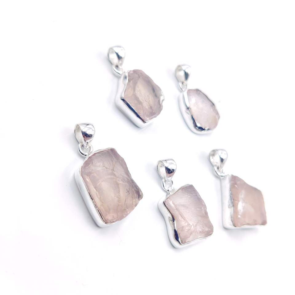 สร้อยคอจี้โรสควอทซ์หยาบประดับพลอยสีชมพูจี้เงินสเตอร์ลิงจิวเวลรี่จี้กุหลาบดิบ