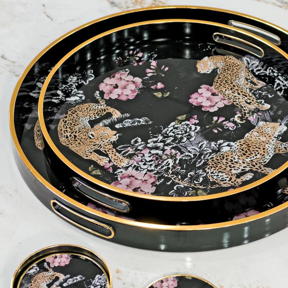 ถาดเสิร์ฟไม้ทรงกลมสวยงามพร้อมถาดออกแบบมันดาลาทำจากไม้สีเข้มเข้มและมีสองมือจับที่ด้านข้าง