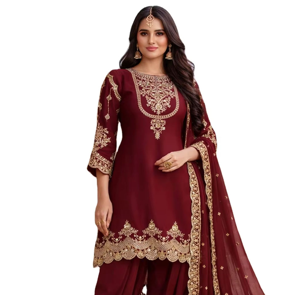 ชุดส่าหรีแบบปักลายสวยงาม ผ้าจอร์เจตต์เนื้อนุ่ม ไม่ยับง่าย สไตล์งานเลี้ยง ความยาวระดับเข่า ทรงปกติ สำหรับผู้หญิง