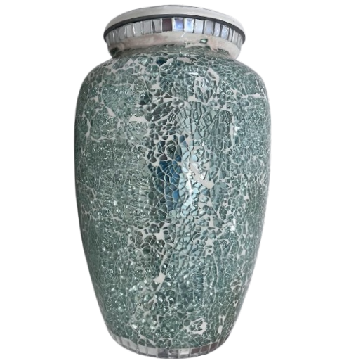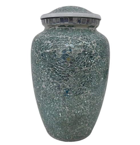 โกศบรรจุอัฐิสำหรับผู้ใหญ่ ทำจากโลหะทองเหลือง/อะลูมิเนียม ประดับด้วยโมเสกแก้วสีเขียวสวยงาม พร้อมสลักข้อความไว้อาลัย