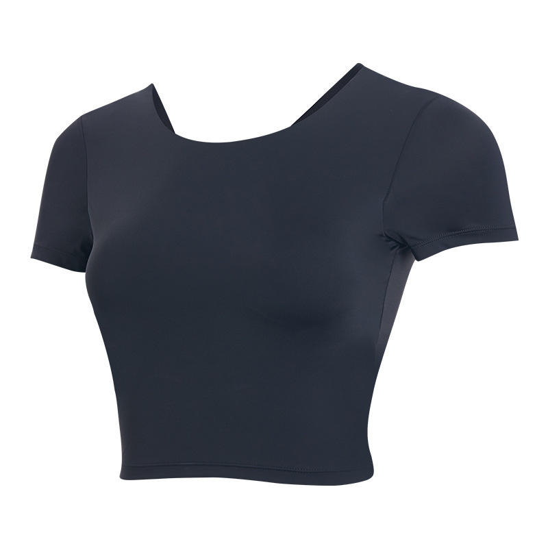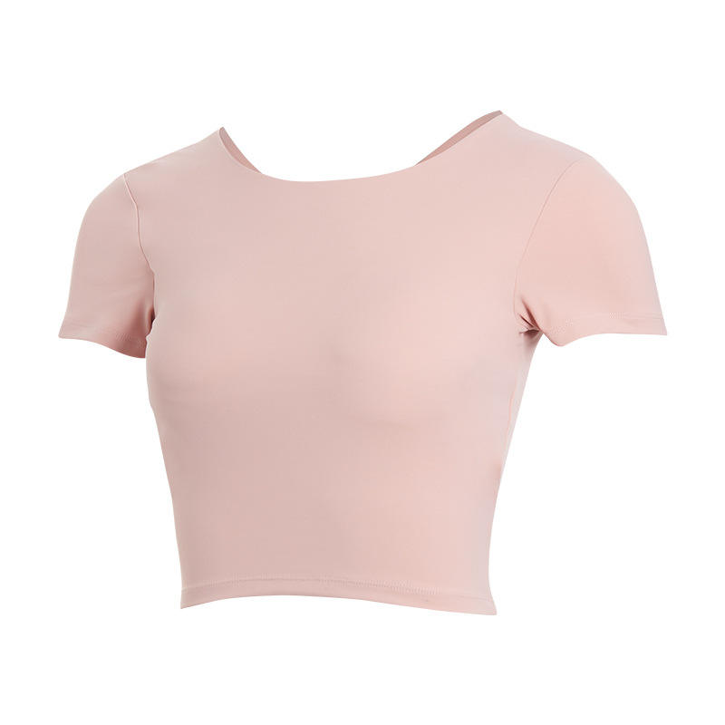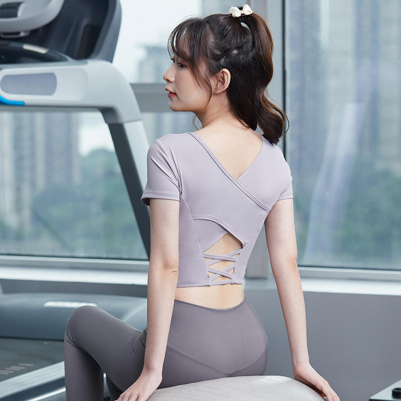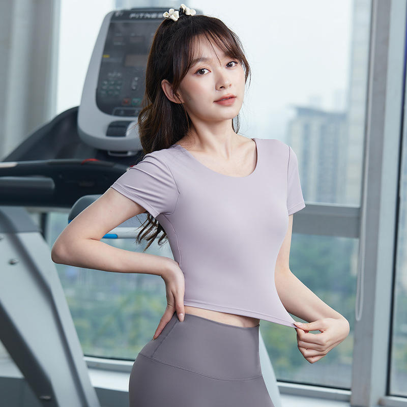 ชุดฟิตเนสแขนสั้นสวยชุดเล่นกีฬาแบบชิ้นเดียวแห้งเร็วถ้วยแบบคงที่ชุดฟิตเนสความรู้สึกนู้ดสวยงาม