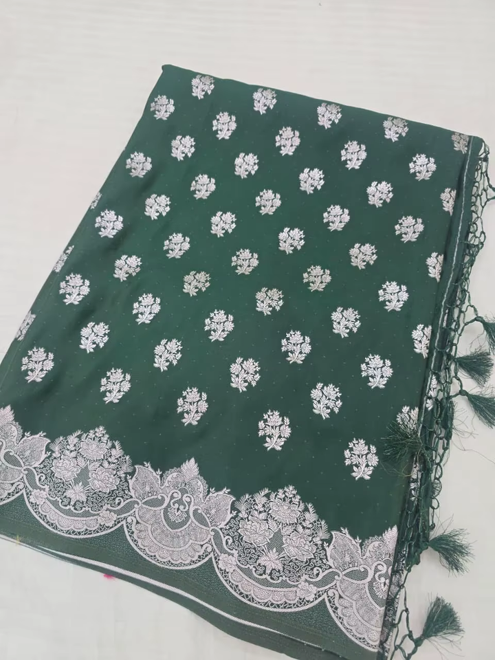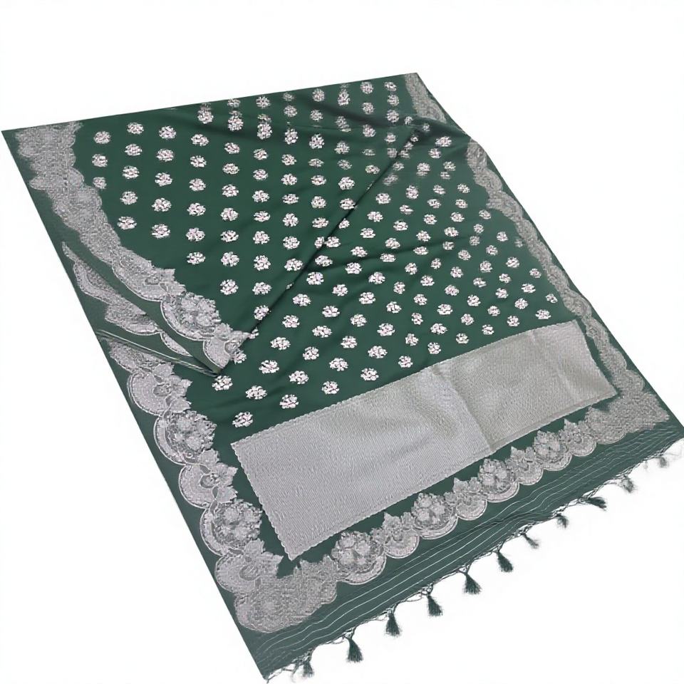 ผ้าไหมมาชรูแบบดั้งเดิม สวยงาม เนื้อนุ่ม ลื่น ง่ายต่อการใช้งาน ลายปักดิ้นเงิน ขอบผ้าแบบบานาราซี สง่างาม ป้องกันแสงแดด เหมาะสำหรับงานปาร์ตี้