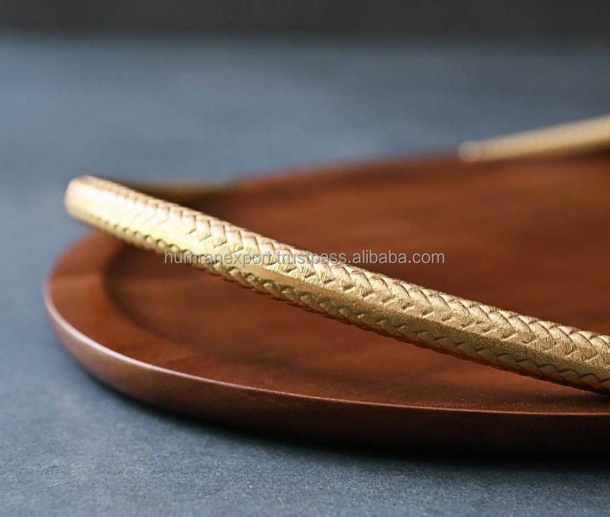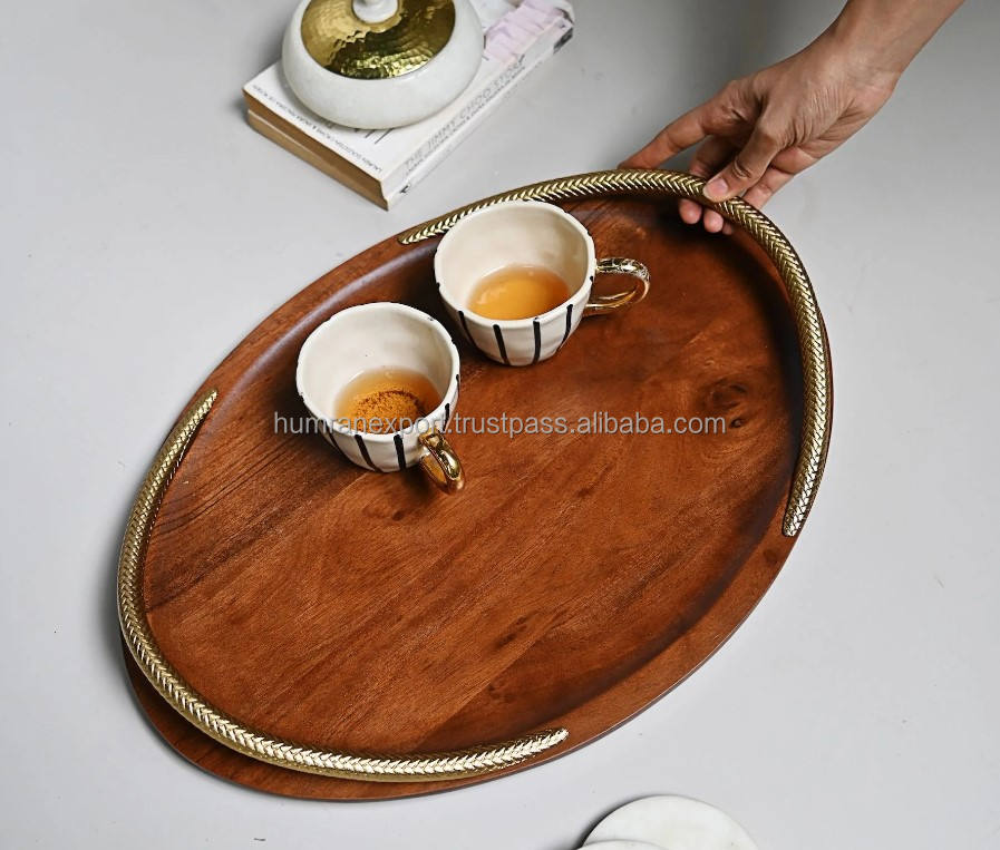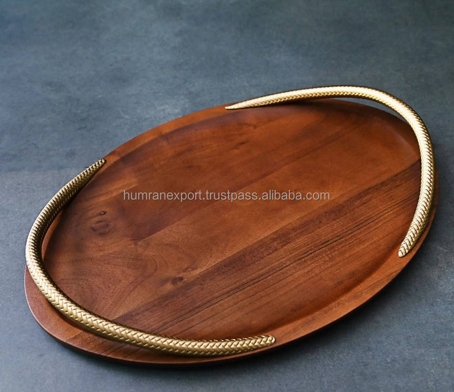 ถาดเสิร์ฟไม้เนื้อแข็งสวยงามพร้อมด้ามจับโลหะถาดตกแต่งทำจากไม้สำหรับบ้านโรงแรมร้านอาหารถาดเก็บของ