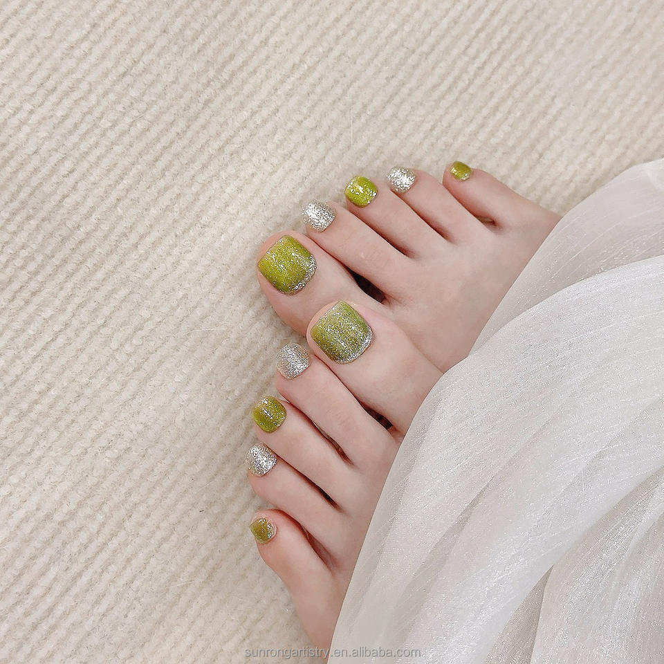 เล็บเท้าปลอมเจลนิ่ม ดีไซน์สวยงาม สีเขียวเงิน ใช้ซ้ำได้