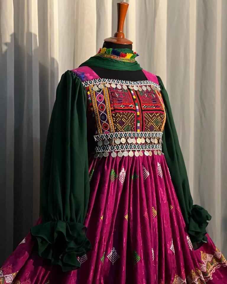 ชุดเดรสแบบชาวอัฟกานิสถานแบบดั้งเดิมที่สวยงามพร้อมแขนสีเขียวเข้มปักลายหน้าอกหลากสีประดับเหรียญ