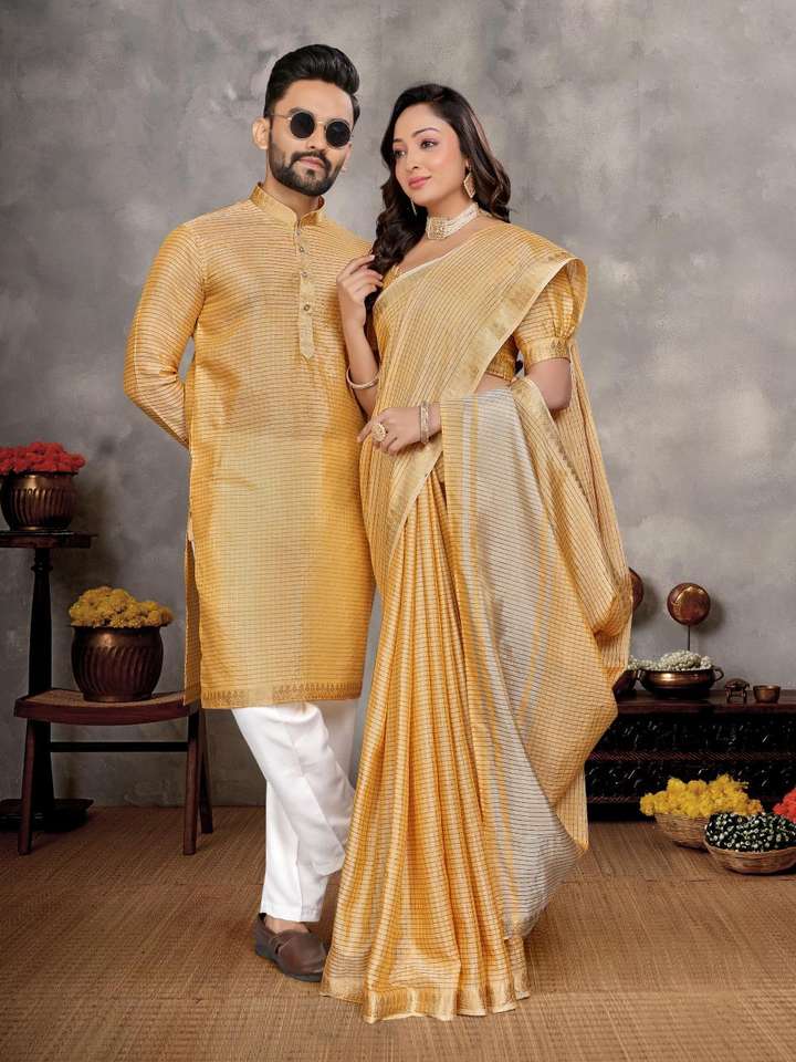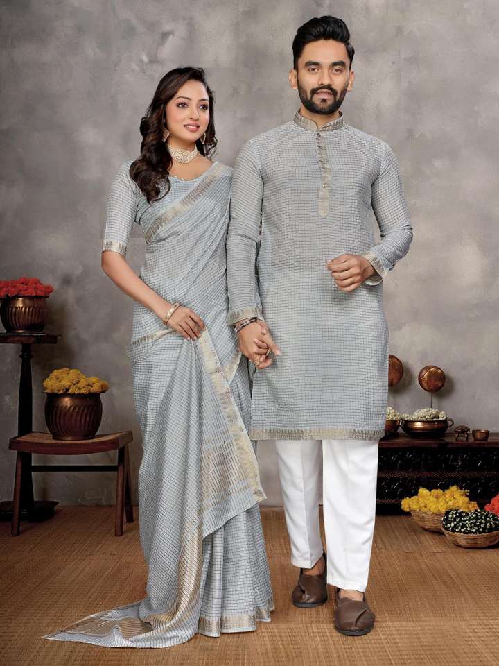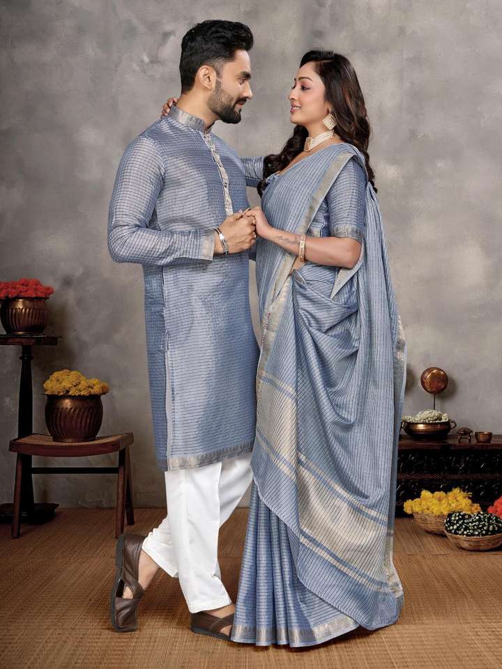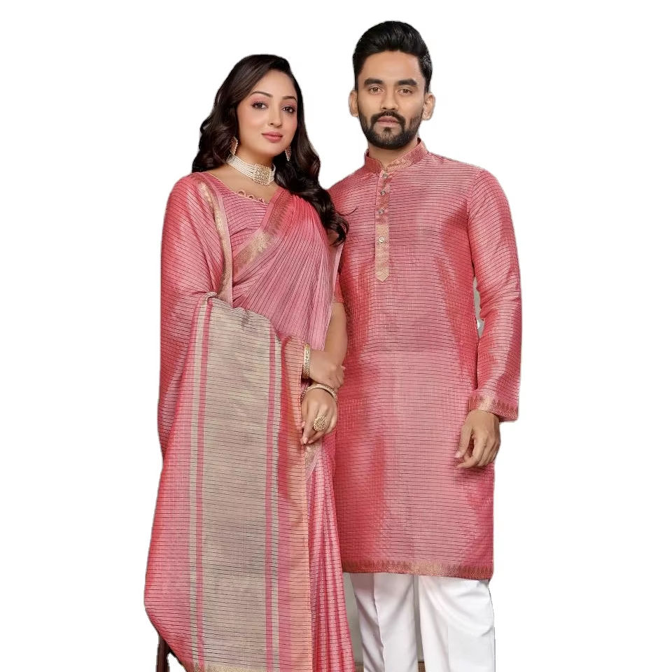 ชุดคู่ที่สวยงามแบบดั้งเดิม Jari การตรวจสอบผ้าไหมกับชุดผ้าแจ็คการ์ดและชุด kurta สำหรับคู่รักทุกโอกาสที่สมบูรณ์แบบ