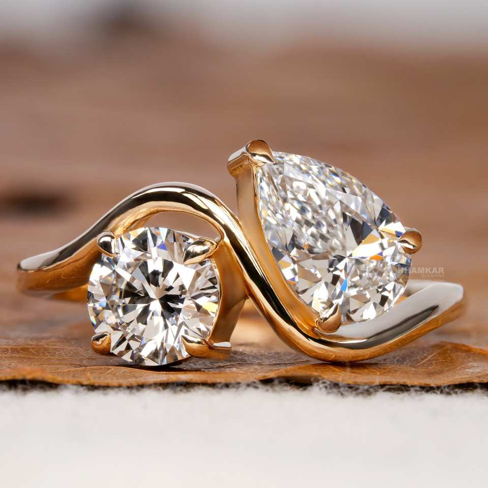 แหวนเพชรสำหรับปลูกในแล็บสองอันสวยงามพร้อมเครื่องประดับเพชรทรงกลมและลูกแพร์ขายส่งแหวนสวยคงที่พร้อมที่ตั้งแบบง่าม