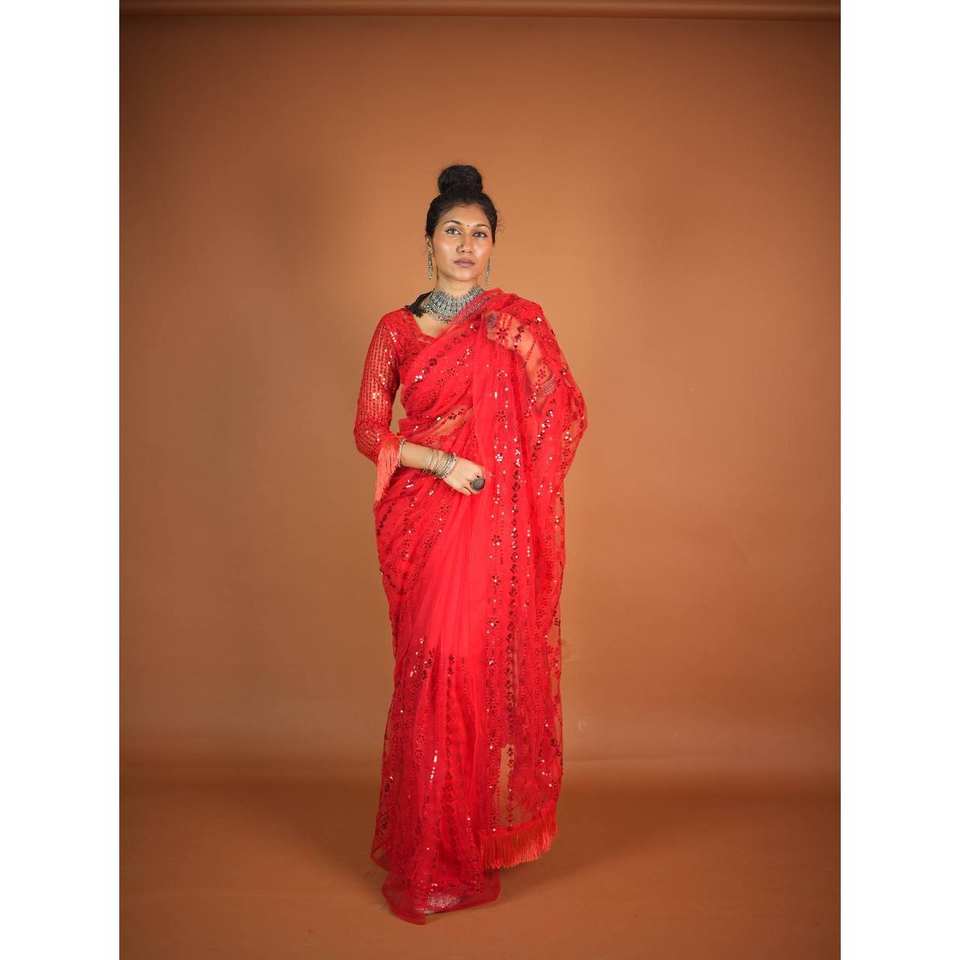 สารีแต่งงานที่สวยงามพร้อมลำดับสีรุ้งและงานด้ายสำหรับงานปาร์ตี้