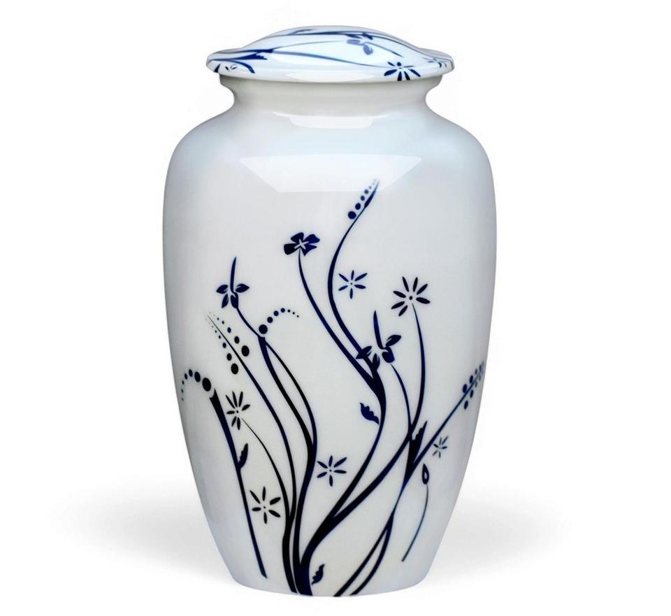 โกศบรรจุอัฐิสำหรับผู้ใหญ่ สีขาวสวยงาม ทำจากทองเหลือง/อะลูมิเนียม พร้อมสลักข้อความไว้อาลัย