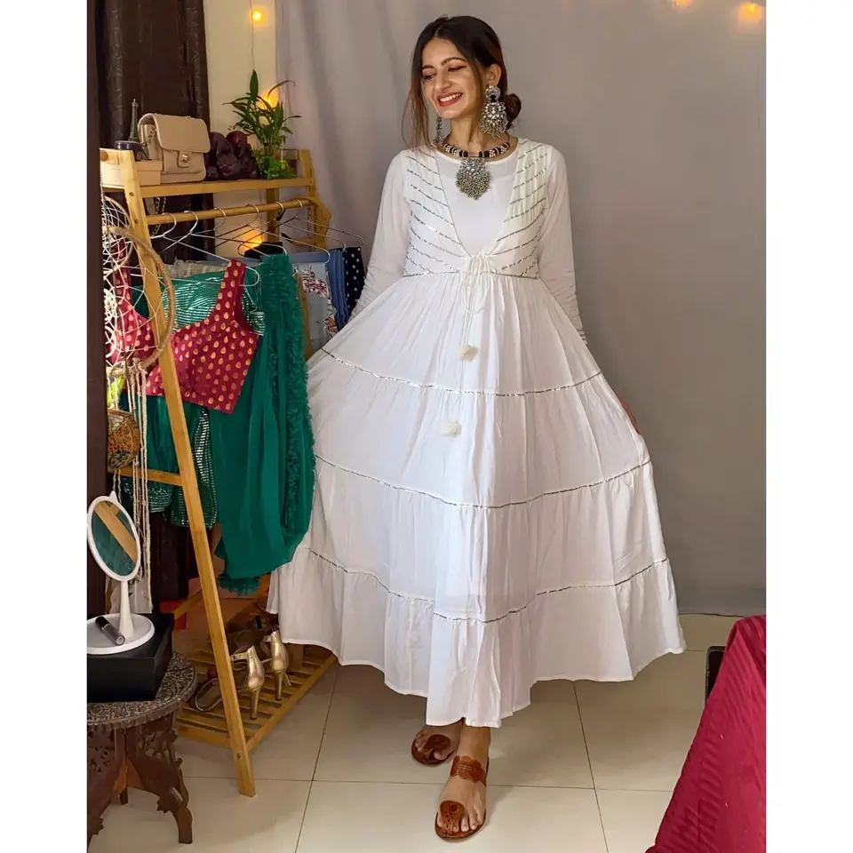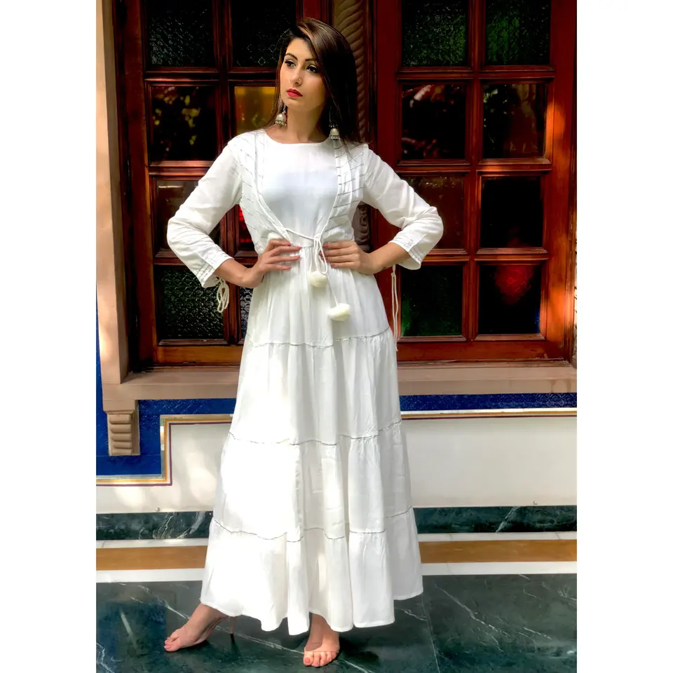 ชุดเดรสออกงานสีขาวสวยงาม แต่งผ้าปักลายกอต้าสีเงิน ดูสง่างามและมีสไตล์