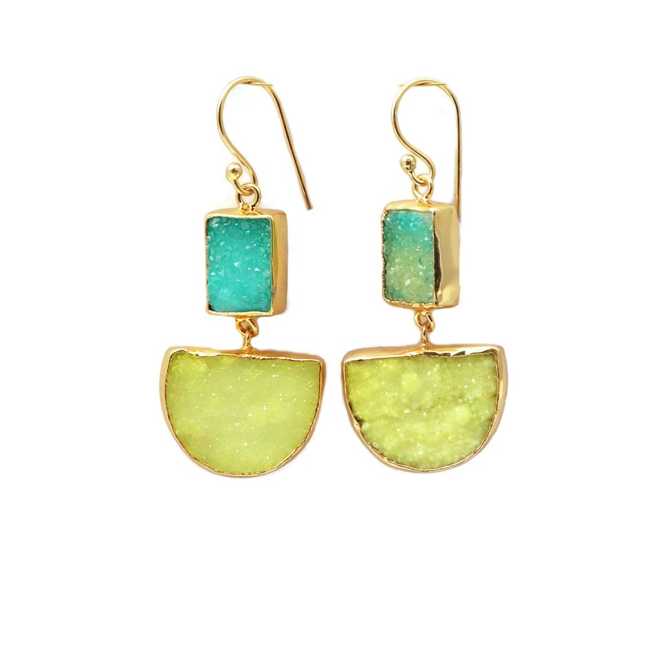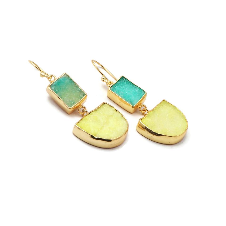 สวยสีเหลืองและสีเขียวน้ำตาล Druzy พลอยต่างหูคู่งบต่างหูสตั๊ดเครื่องประดับชุบทองตะขอต่างหูของขวัญ