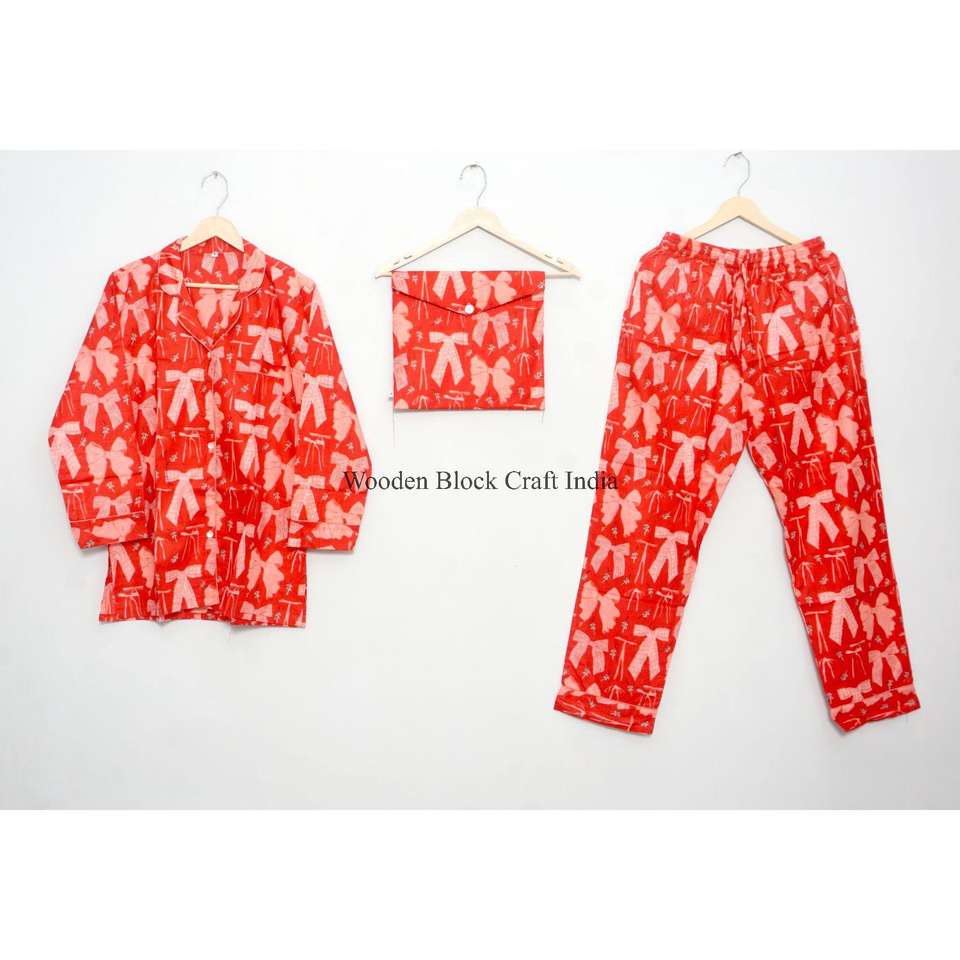 ชุดนอนผ้าฝ้ายพิมพ์ลายโบว์สวยงาม เสื้อและกางเกงเข้าชุด นุ่มเบาสบาย เหมาะสำหรับฤดูร้อน ชุดนอนสำหรับผู้หญิง ชุดนอนกลางคืน