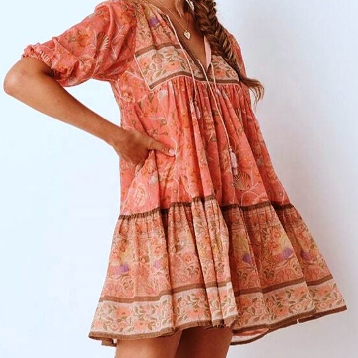 Beautiful Women Mini Dress and All Occasion Flower Printed Short Sleeve Dress with v Neck and Ruffled Girls Mini Dress