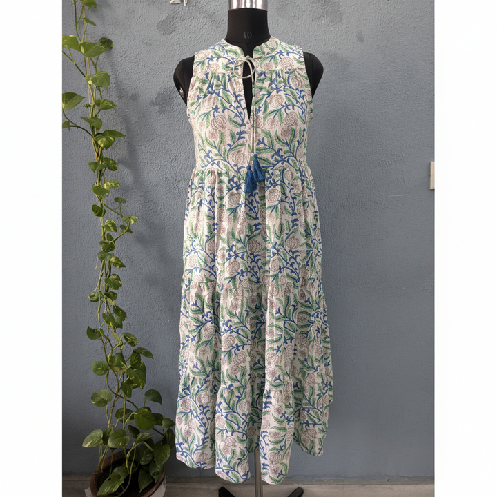 เดรสยาวผ้าฝ้ายพิมพ์ลายบล็อกด้วยมืออย่างสวยงาม ดีไซน์ลำลองแบบไม่มีแขน คอวี ลายดอกไม้ โลโก้ด้านหลัง สวยหวานเป็นธรรมชาติ