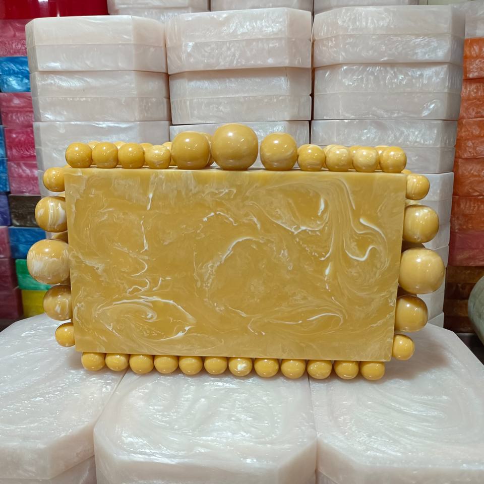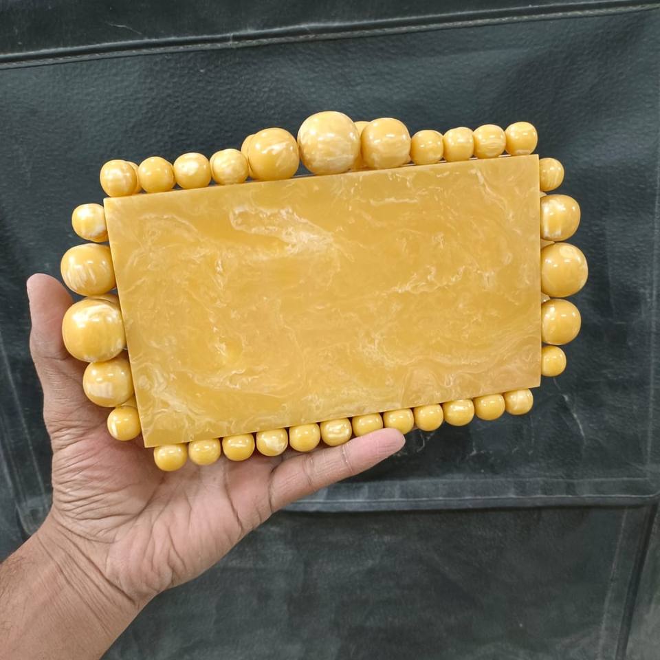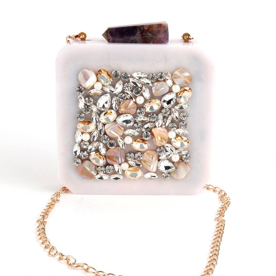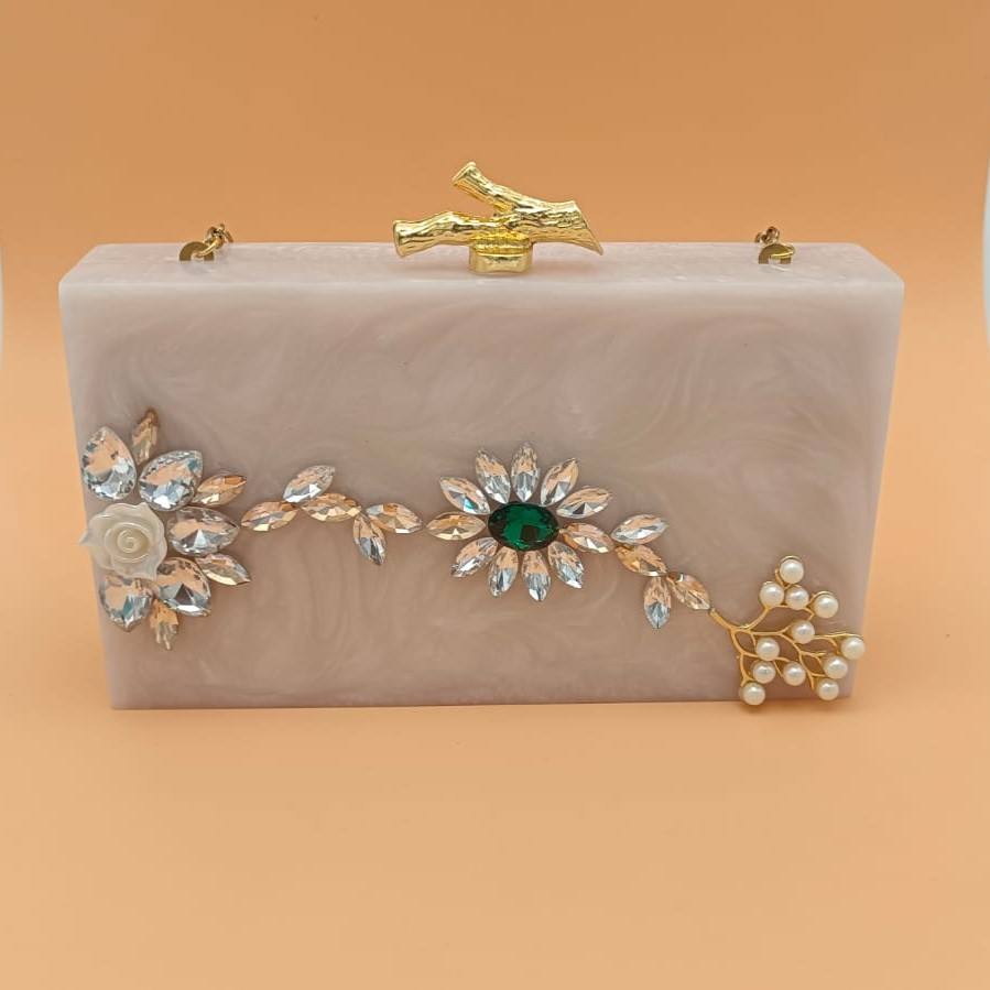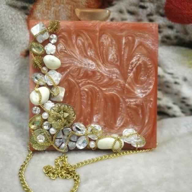กระเป๋าคลัทช์ผู้หญิงทำมือสวยงาม งานเรซิ่น ประดับมุกและกระดุมคริสตัล ปิดแบบเปิด ซับในผ้าฝ้าย
