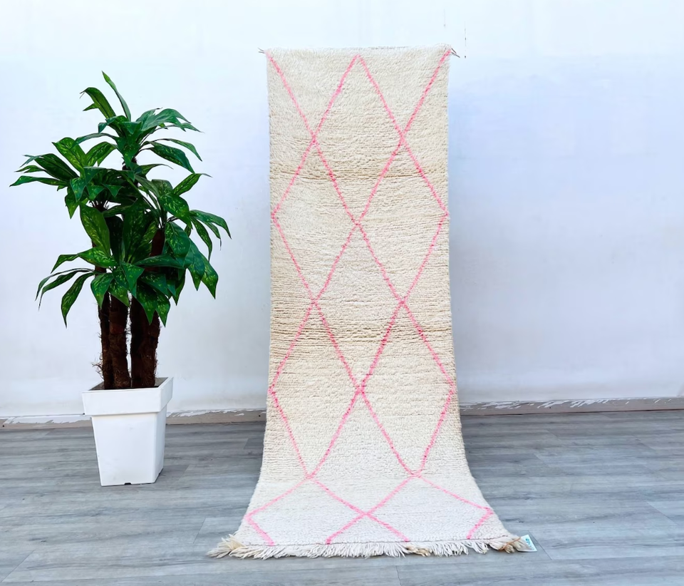 Beni Ourain Runner,พรมปูในห้องโถงขนสัตว์แท้ขนาดใหญ่โมร็อกโกทำด้วยมือสวยงามสีขาวและสีชมพู