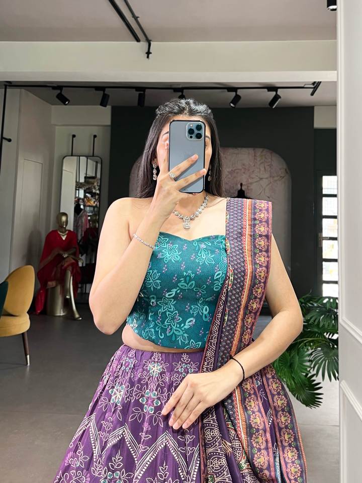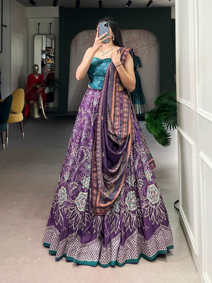 ชุดเลเฮนกาโชลีผ้าไหมไวชาลีพิมพ์ลายสวยงาม แบบสองด้าน พร้อมคุณสมบัติป้องกันแสงแดด แห้งเร็ว เหมาะสำหรับงานแต่งงาน งานดิวาลี ทุกฤดูกาล