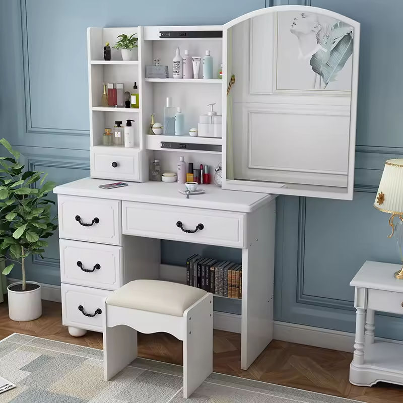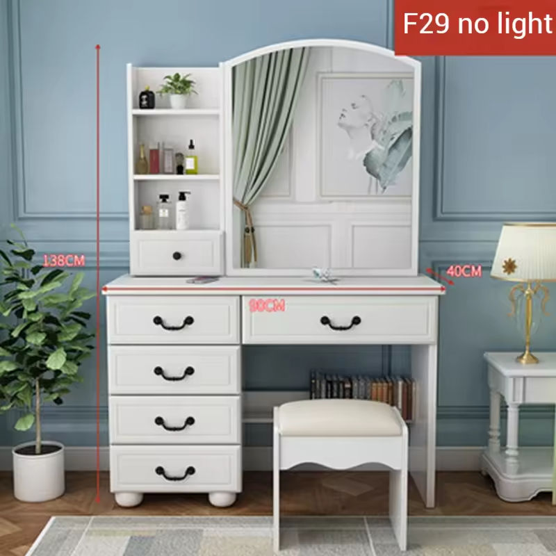 โต๊ะเครื่องแป้งสไตล์ยุโรปแบบมินิมอลพร้อมกระจก วัสดุเคลือบลามิเนต พร้อมที่เก็บของในตัว ขนาด 90 ซม. ไฟ LED ทนทาน ชุดโต๊ะเครื่องแป้ง