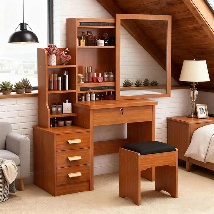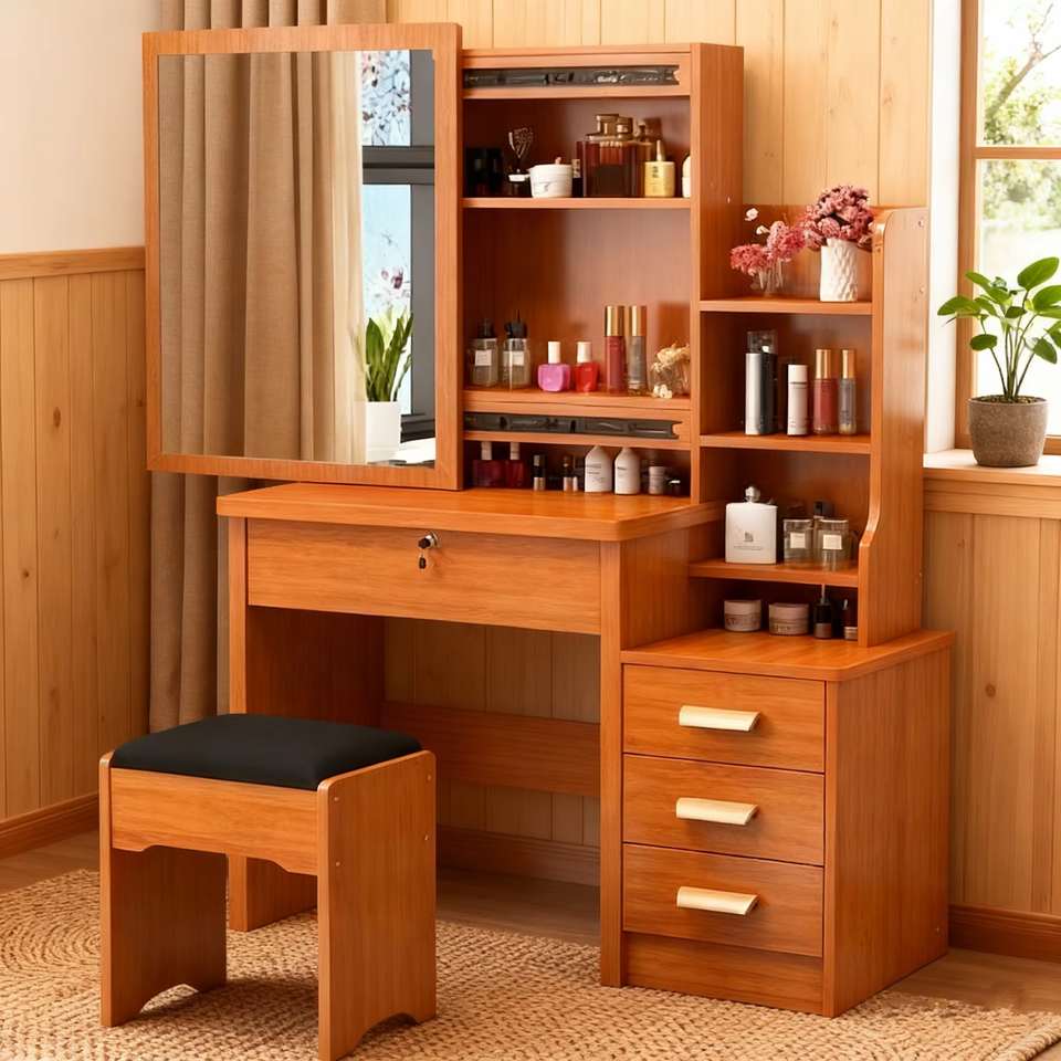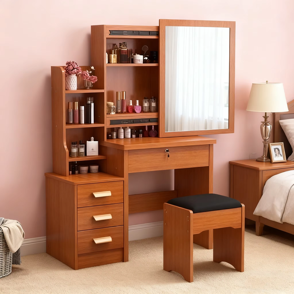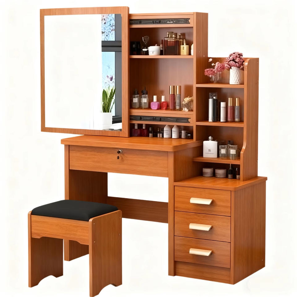 โต๊ะเครื่องแป้งไม้สีน้ำตาลสไตล์นอร์ดิกสำหรับผู้หญิง พร้อมกระจก ราคาส่งถูก