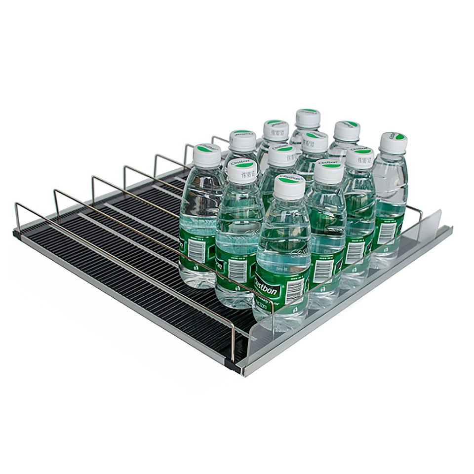 ชั้นวางโชว์ลูกกลิ้งแบบกราวิตี้ขวดเบียร์ที่ดันหน้าซูเปอร์มาร์เก็ตอัตโนมัติ