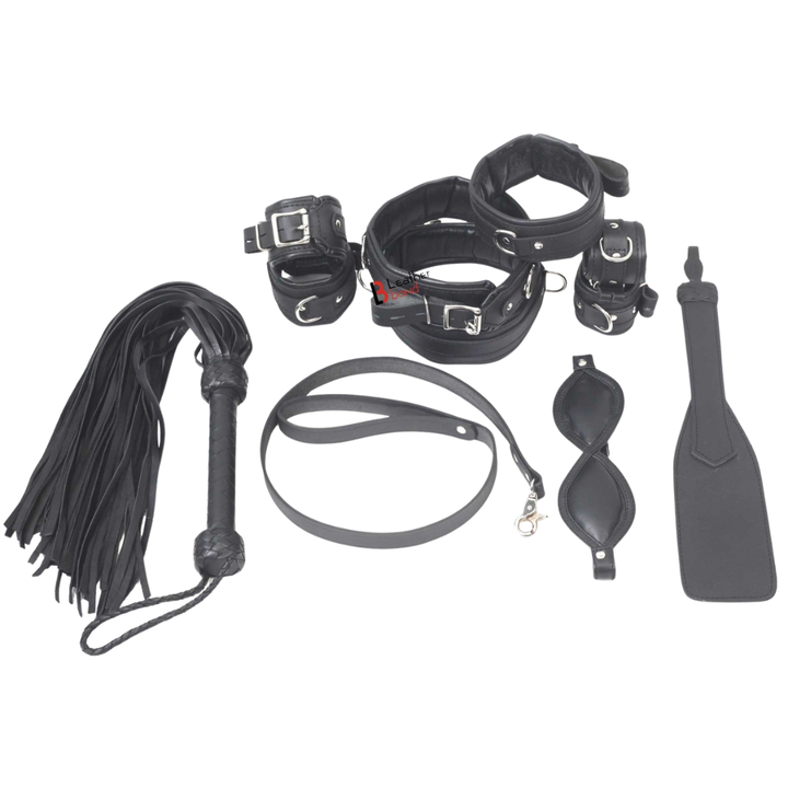 ชุดเซ็กซี่สำหรับผู้ชายมือใหม่ สีดำ พร้อมกุญแจมือหนัง ผ้าปิดตาลูกไม้ ไม้ตี และอุปกรณ์เสริม