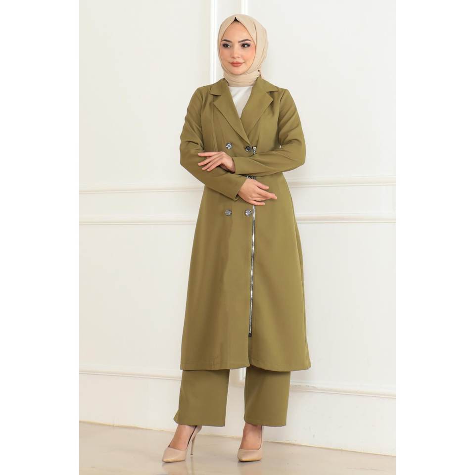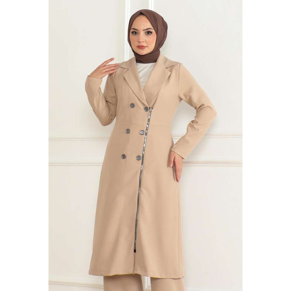 ชุดลำลองสีเบจ 19219 แต่งกระดุมและซิป ชุดเซ็ต 2 ชิ้น ความยาวปานกลางเหนือเข่า สำหรับฤดูร้อน ไซส์ 2XL