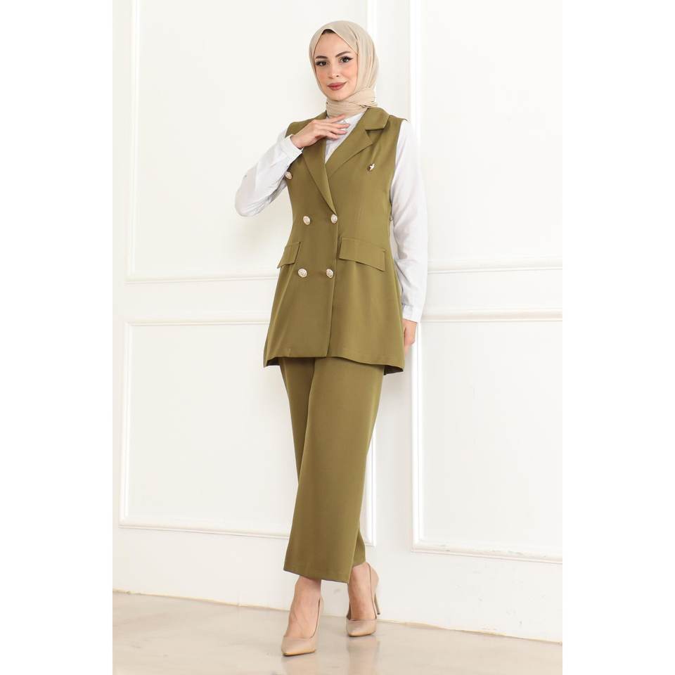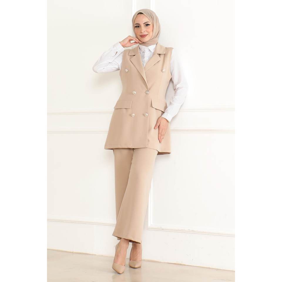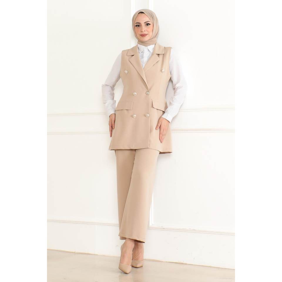 ชุดลำลองสองชิ้นสีเบจ 19231 กางเกงขาสั้นยาวเหนือเข่าและเสื้อทรงปกติ ผ้าฝ้าย 100% เสื้อผ้าสำหรับฤดูร้อน
