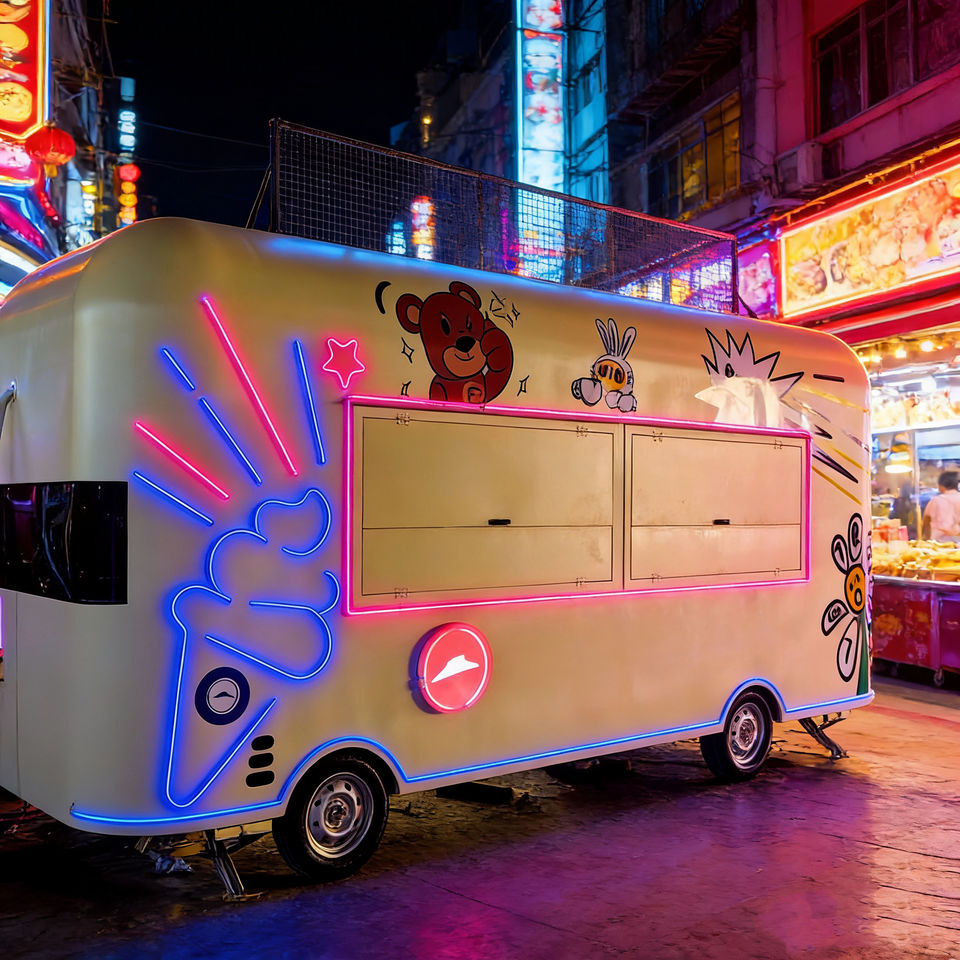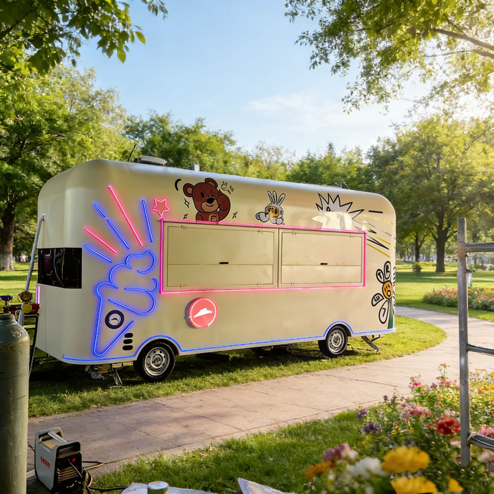 รถเข็นขายของเคลื่อนที่สีเบจ 4 ล้อ ทำจากสแตนเลส พร้อมไอศกรีมและกราฟิกที่สนุกสนาน สำหรับการดำเนินการขายอาหารในตลาดกลางคืนในเมือง