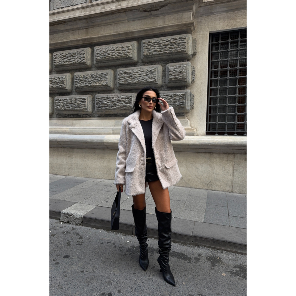 เสื้อแจ็คเก็ตผู้หญิงสไตล์บอยเฟรนด์ ผ้าแคชเมียร์ผสมขนอัลปาก้า สีเบจ