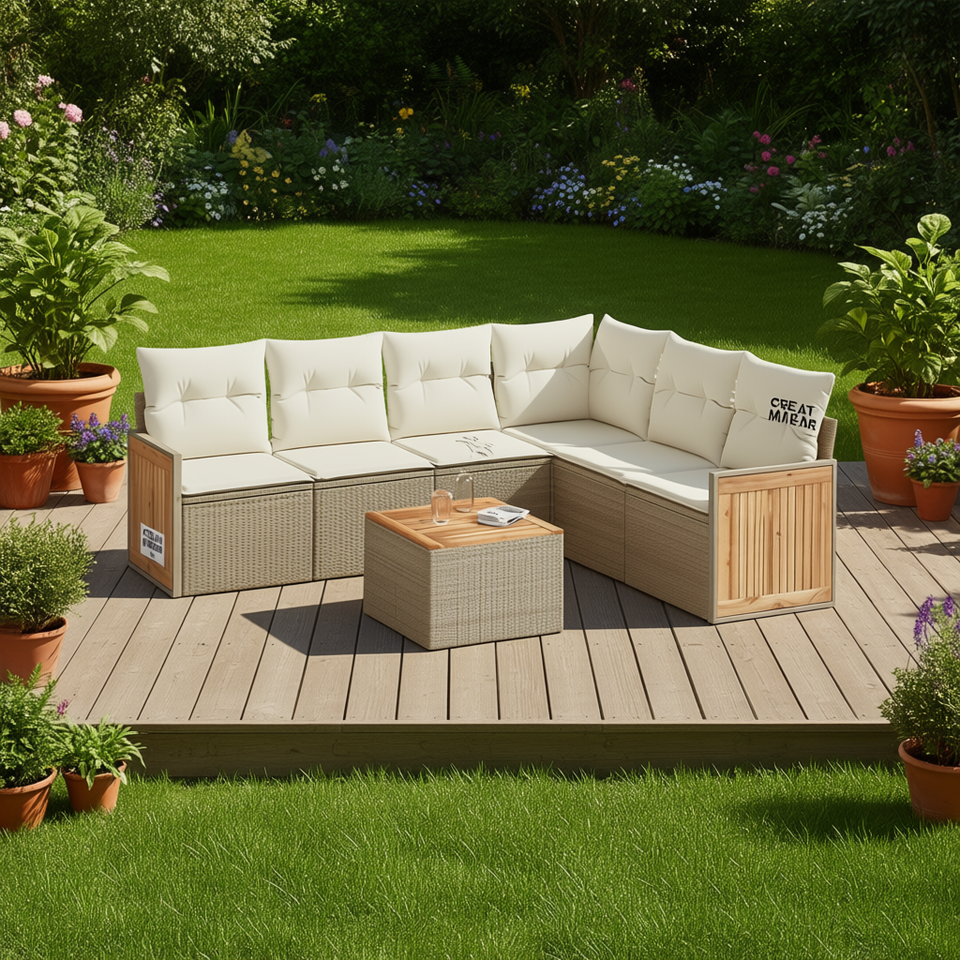 ชุดโซฟาสวนหวายสีเบจ เฟอร์นิเจอร์กลางแจ้งพร้อมเบาะโฟมความหนาแน่นสูง กันน้ำ ดีไซน์ร่วมสมัย