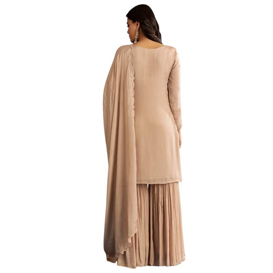 ชุดคุर्ตา ชาราร่า ผ้าจอร์เจียต์สีเบจ ปักลายด้วยด้ายและเลื่อม งานแต่งงาน งานเลี้ยง งานเทศกาล ใส่ได้ทุกฤดู สั่งตัดได้ตามแบบ ชุดประจำชาติ