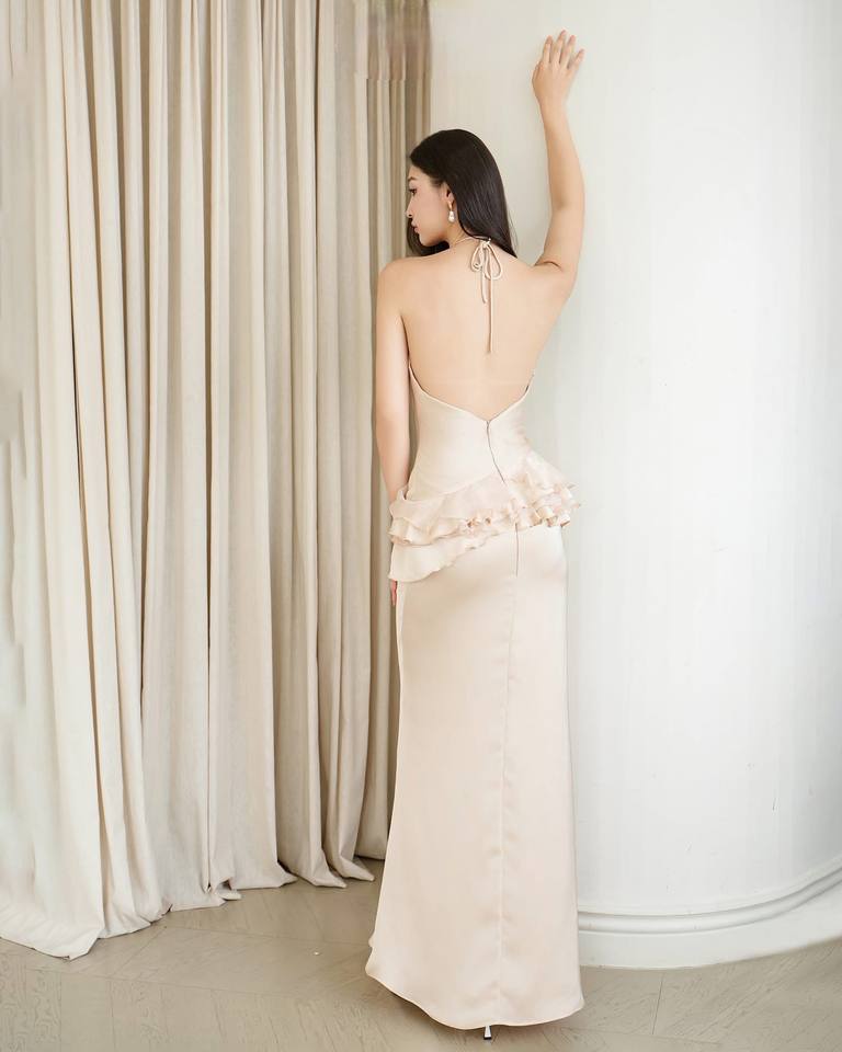 ชุดราตรีผ้าซาตินคล้องคอสีเบจชุดเดรสยาวหรูหราแต่งระบายมีรายละเอียดผลิตในเวียดนาม