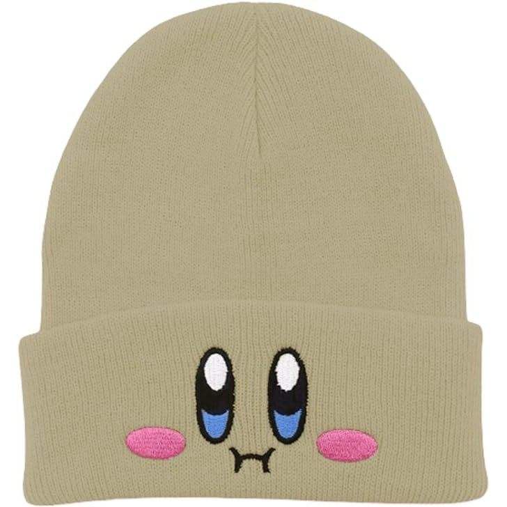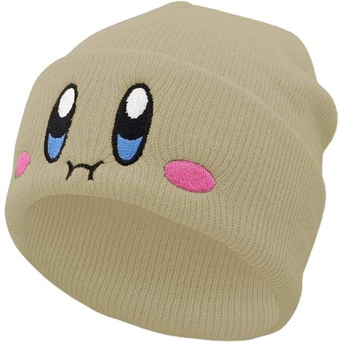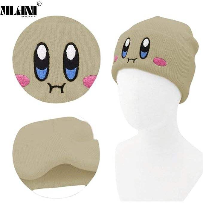 หมวกแคชเมียร์สีเบจพิมพ์ลายอนิเมะของเคอร์บี้น่ารักหมวกแฟชั่นฤดูหนาวพร้อมโลโก้ปักตามต้องการสำหรับฉากชายหาดของเด็กทารก