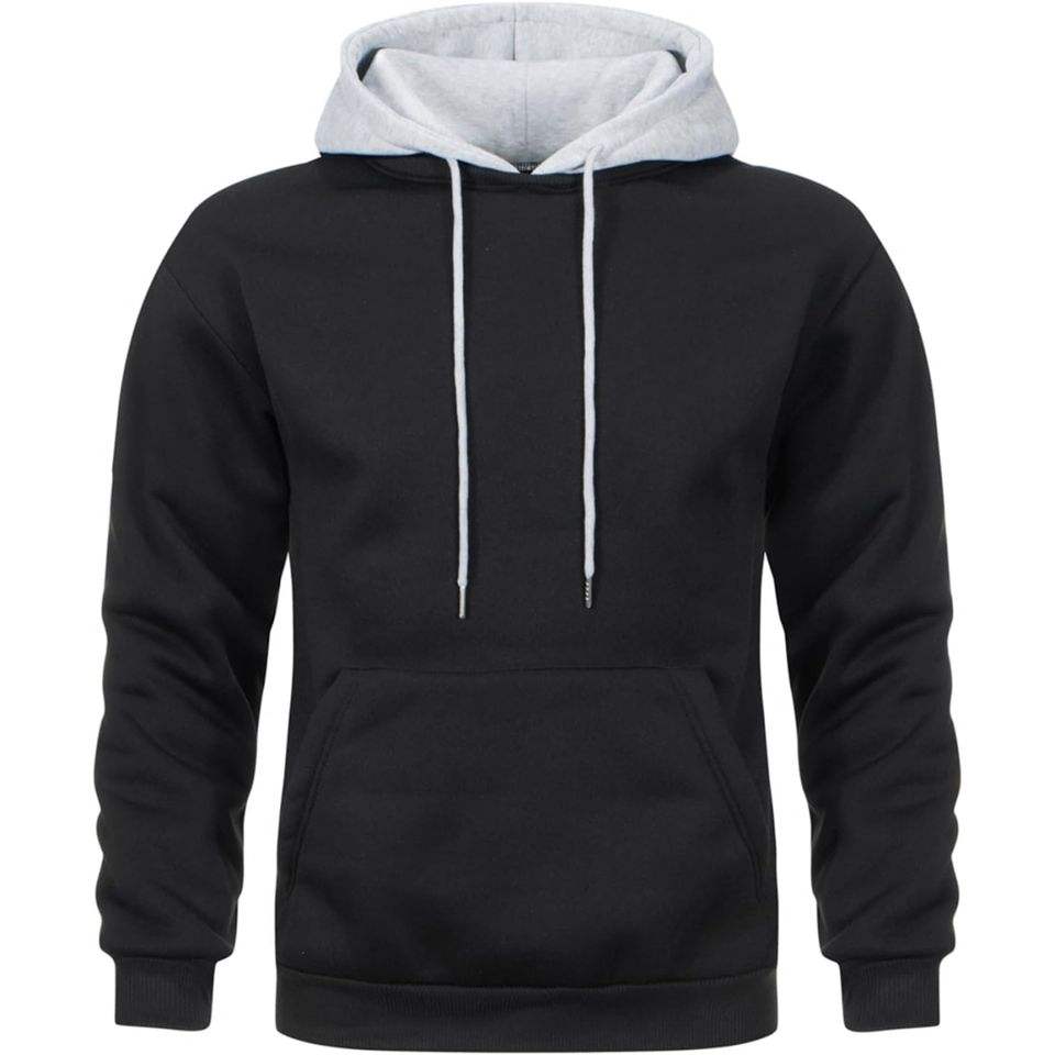 เสื้อฮู้ดสีดำสำหรับผู้ชาย พร้อมฮู้ดสีเทาตัดกัน เสื้อสเวตเชิ้ตผ้าฟลีซลำลอง สไตล์สตรีทแวร์สำหรับฤดูหนาว