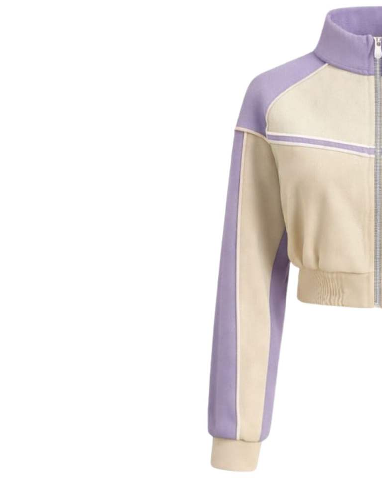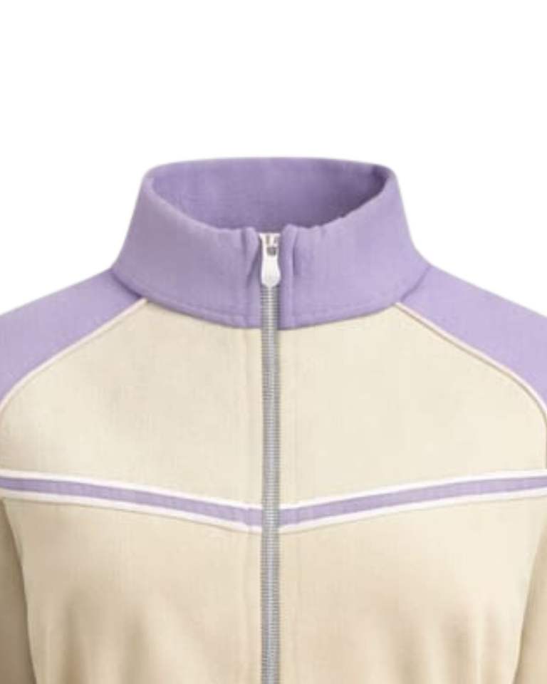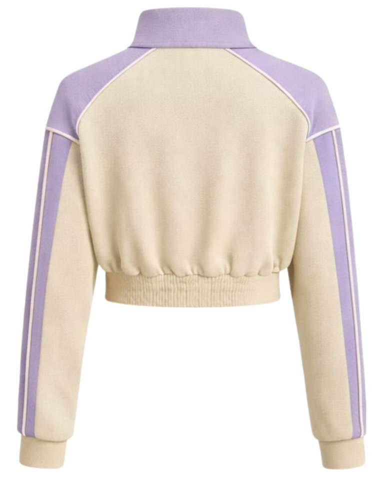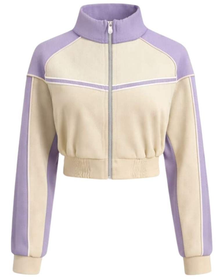 เสื้อแจ็คเก็ตครอปผู้หญิงสีเบจลาเวนเดอร์แบบซิป เสื้อแจ็คเก็ตออกกำลังกาย เสื้อผ้ากีฬา ฟิตเนส แอคทีฟแวร์ แถบสีตัดกัน เสื้อแจ็คเก็ตสำหรับฝึกซ้อม แบบสั่งทำได้