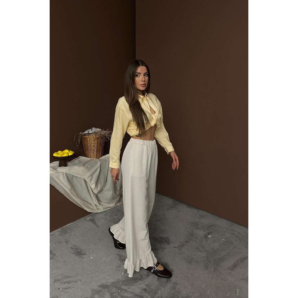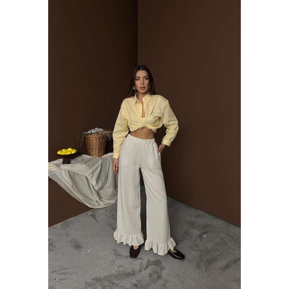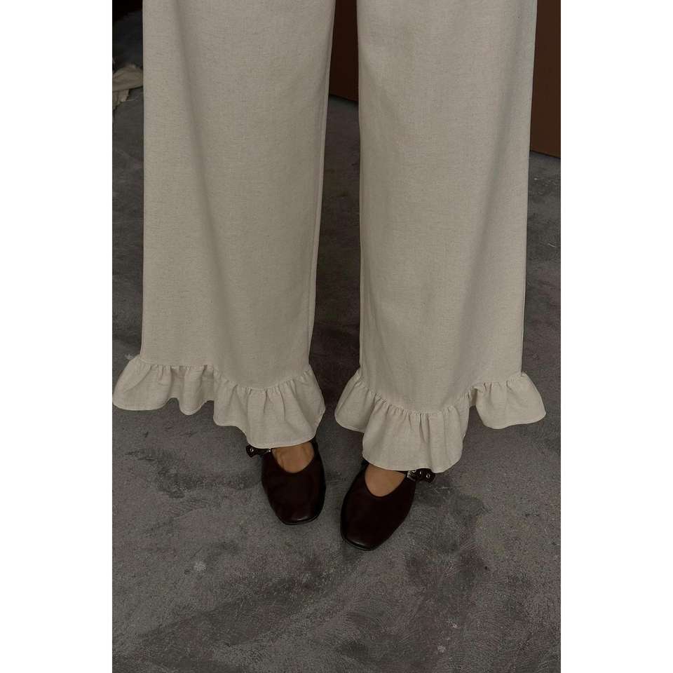 Beige Linen Trousers Straight Fit Mid Waist Ruffled Hem Breathable Women's Pants