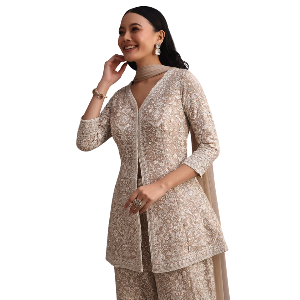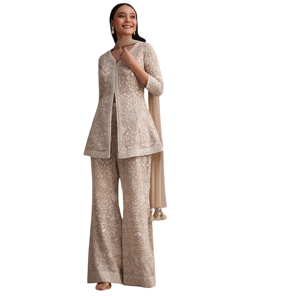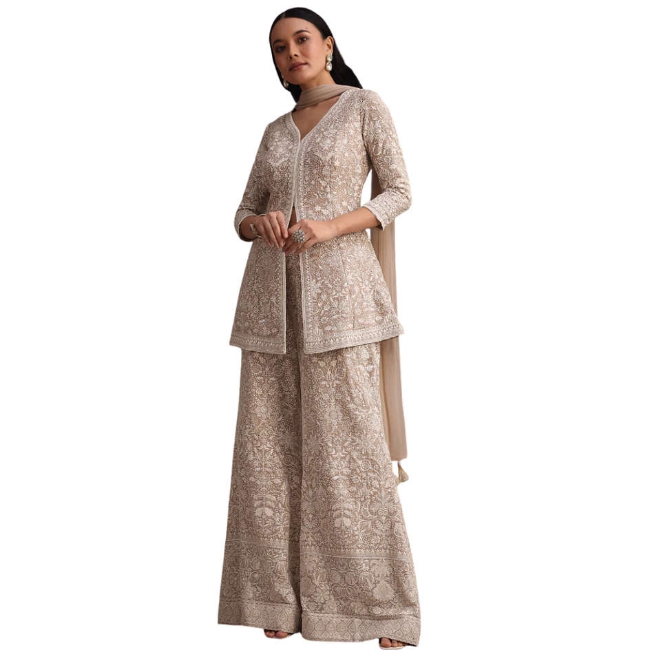 ชุดสีเบจ lucnowi kurti Palazzo พร้อมตาข่ายเครื่องแต่งกายแบบชนเผ่าขายส่งจากโรงงาน