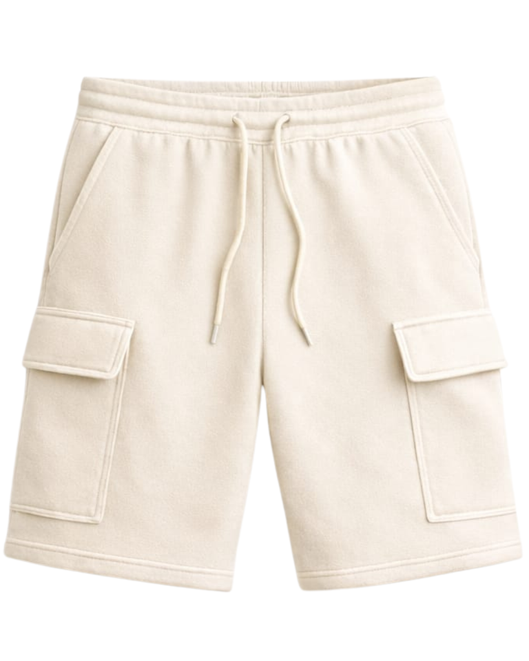 กางเกงขาสั้นคาร์โก้สีเบจสำหรับผู้ชาย เอวยางยืด มีเชือกผูก สไตล์ลำลอง สตรีทแวร์ กระเป๋าหลายช่อง กางเกงขาสั้นฤดูร้อน รับทำโลโก้ตามสั่ง ผู้ผลิต OEM