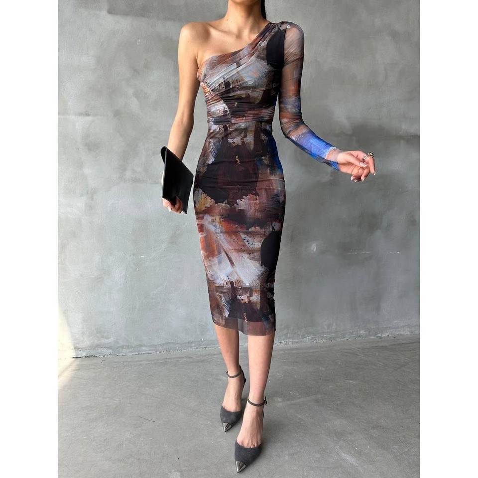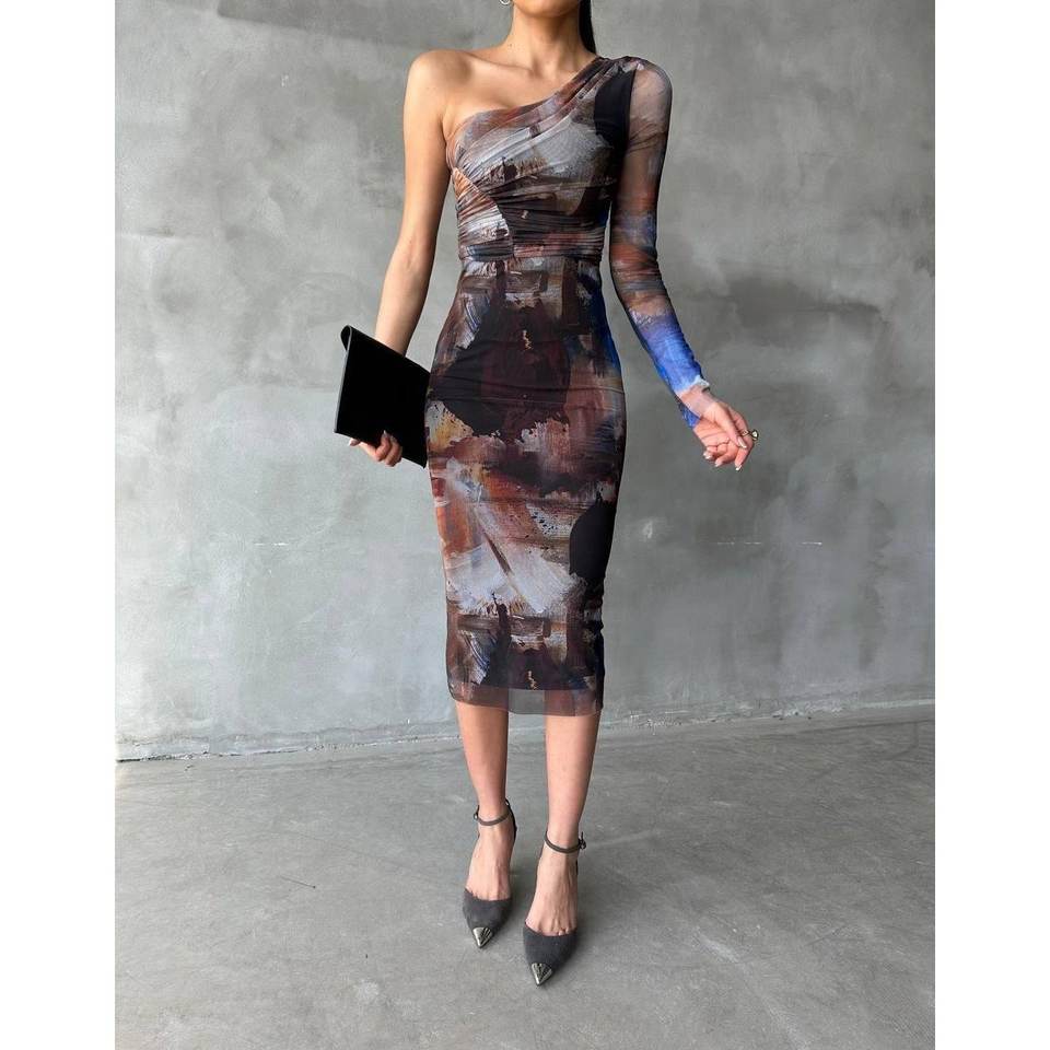 เดรสผ้าทูลสีเบจแขนเดียว ประดับเลื่อมและลูกปัด คอสูง ทรงเอไลน์ ยาวกรอมพื้น สไตล์งานเลี้ยงกลางคืน ฤดูหนาว ไซส์ XL