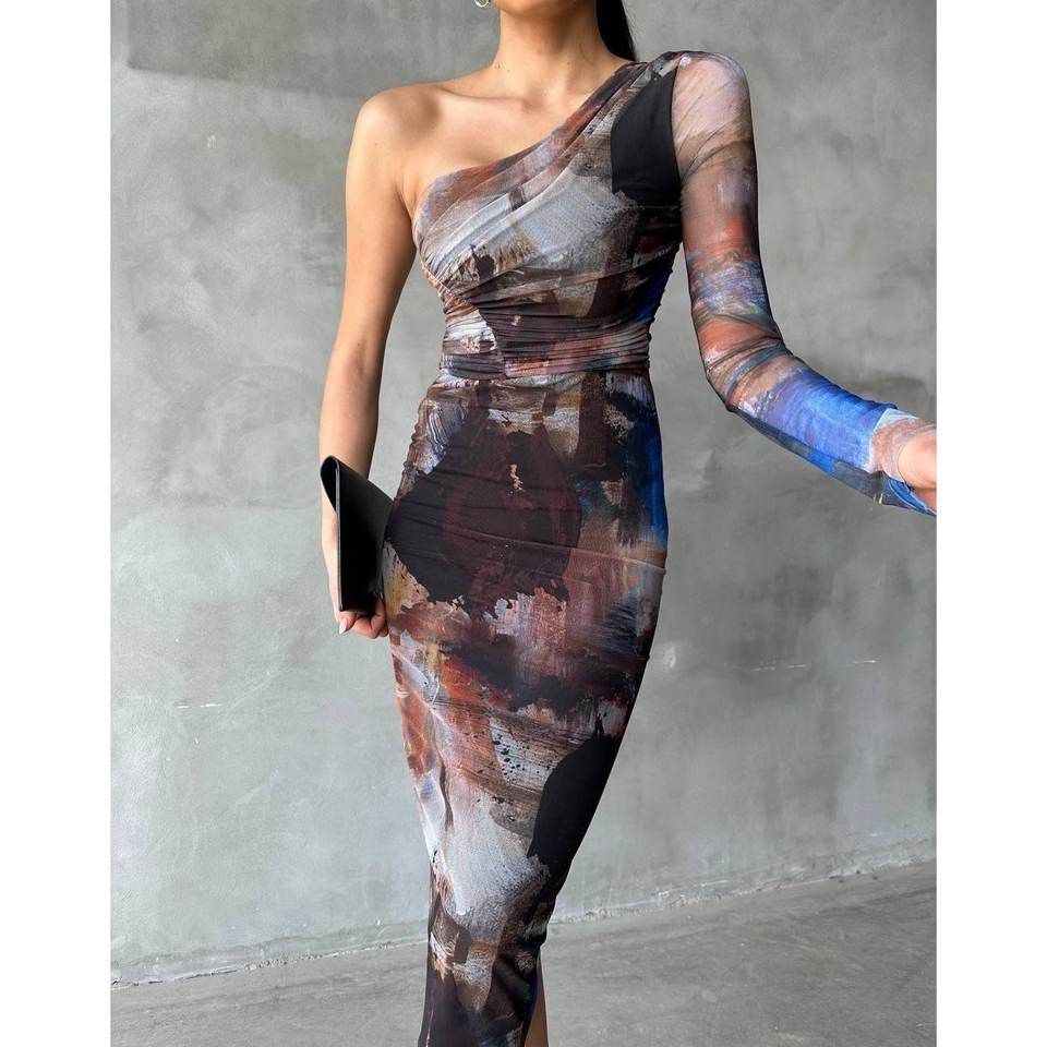 ชุดเดรสผ้าทูลสีเบจแขนเดียว ประดับเลื่อมและลูกปัด คอสูง ทรงเอไลน์ ยาวถึงพื้น ไซส์ XL สำหรับงานเลี้ยงตอนเย็นในฤดูหนาว