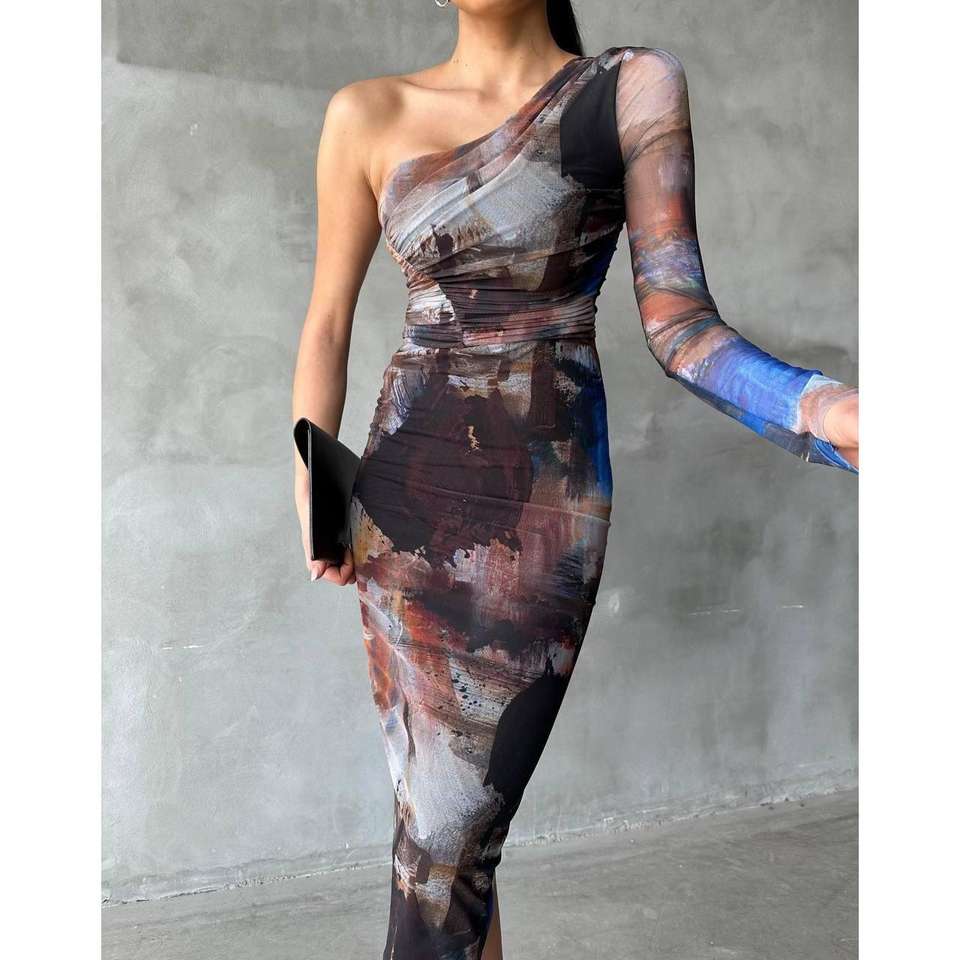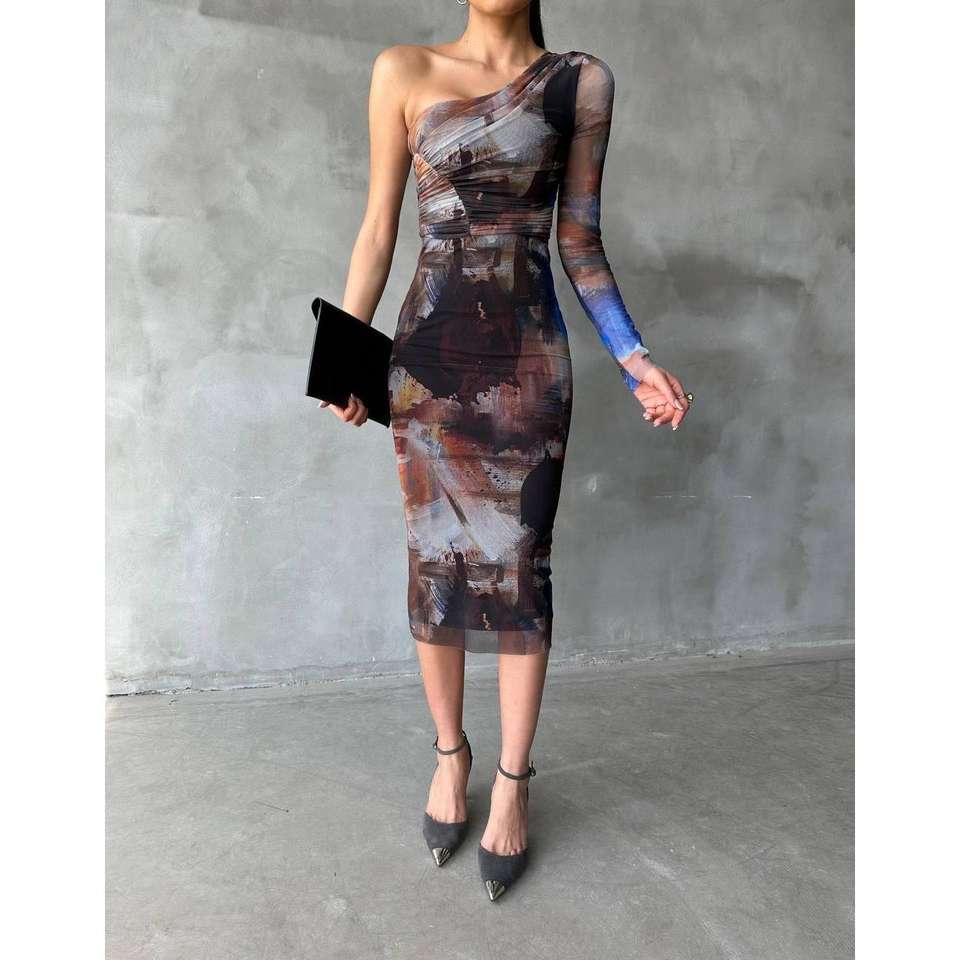 ชุดราตรีผ้าทูลสีเบจแขนเดียว