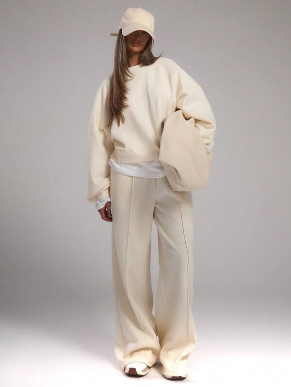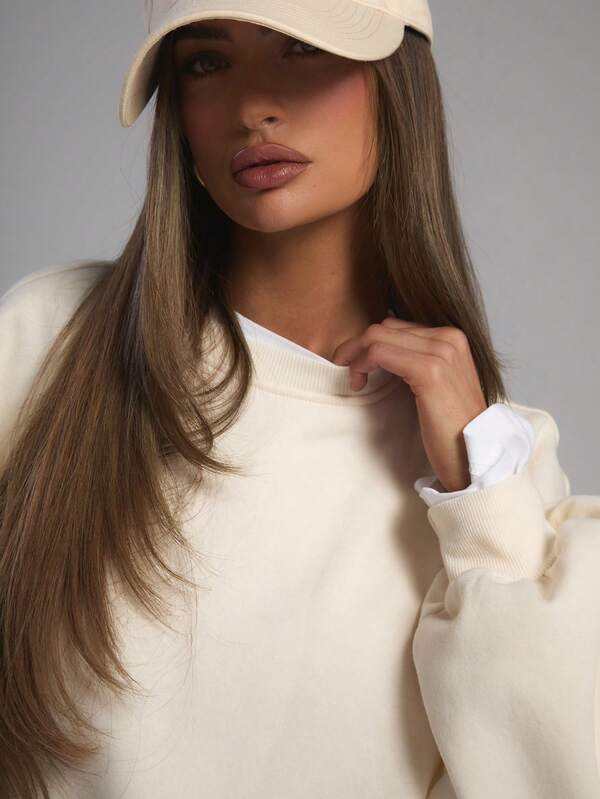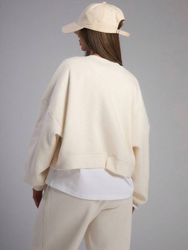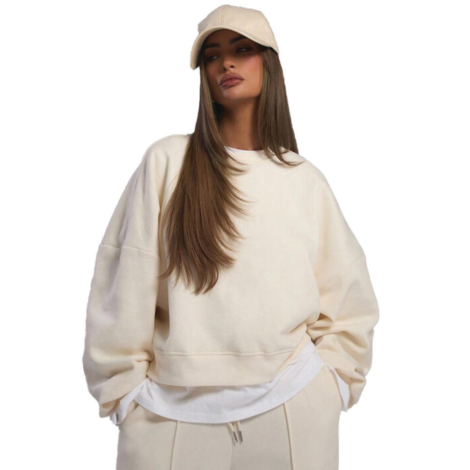 เสื้อสเวตเตอร์คอกลมสำหรับผู้หญิงสีเบจโอเวอร์ไซส์ผ้าฟลีซคอตตอนเสื้อสวมหัวทรงหลวมเปิดไหล่ระบายอากาศเครื่องแต่งกายลำลองสำหรับฤดูหนาว