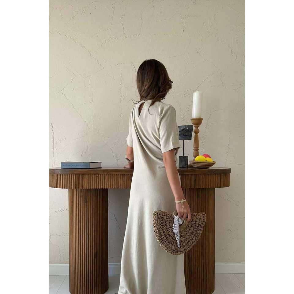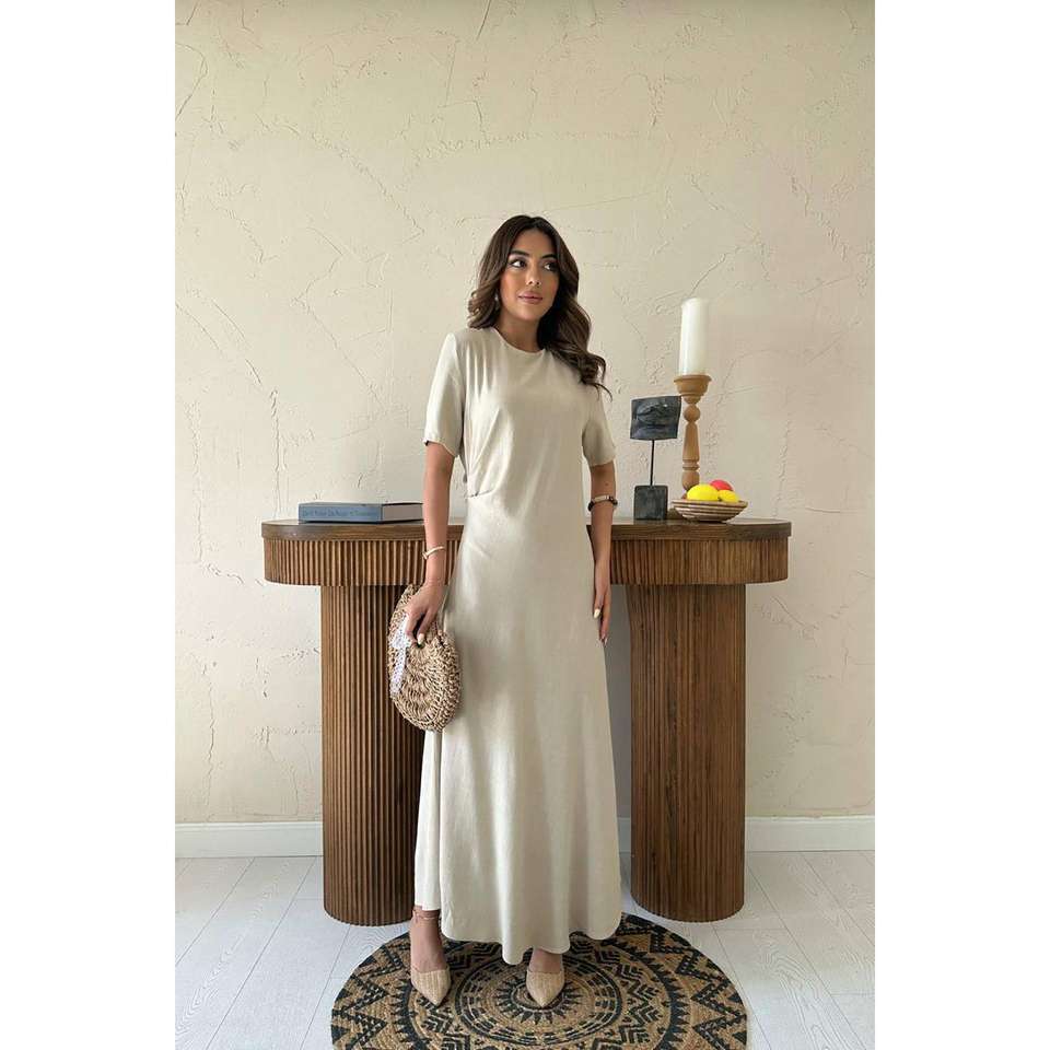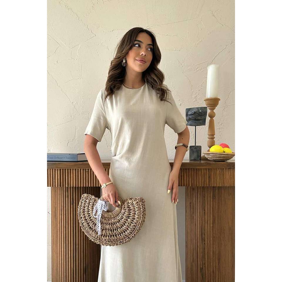 เดรสคอปกจีบสีเบจ ทรงหลวม ผ้าทอ ระบายอากาศได้ดี ใส่ได้ทุกวัน เดรสลำลอง เอวธรรมชาติ
