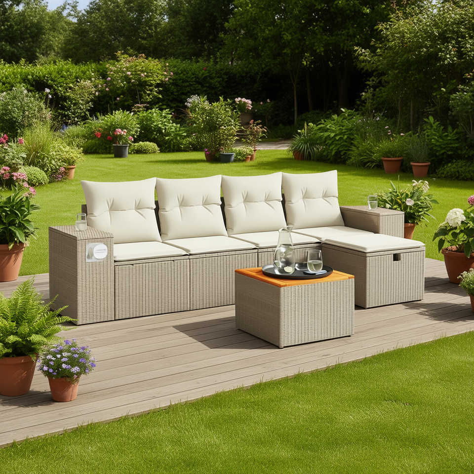 ชุดโซฟาหวายสีเบจสำหรับสวน 4 ที่นั่ง เฟอร์นิเจอร์กลางแจ้ง ดีไซน์ร่วมสมัย โครงหวาย