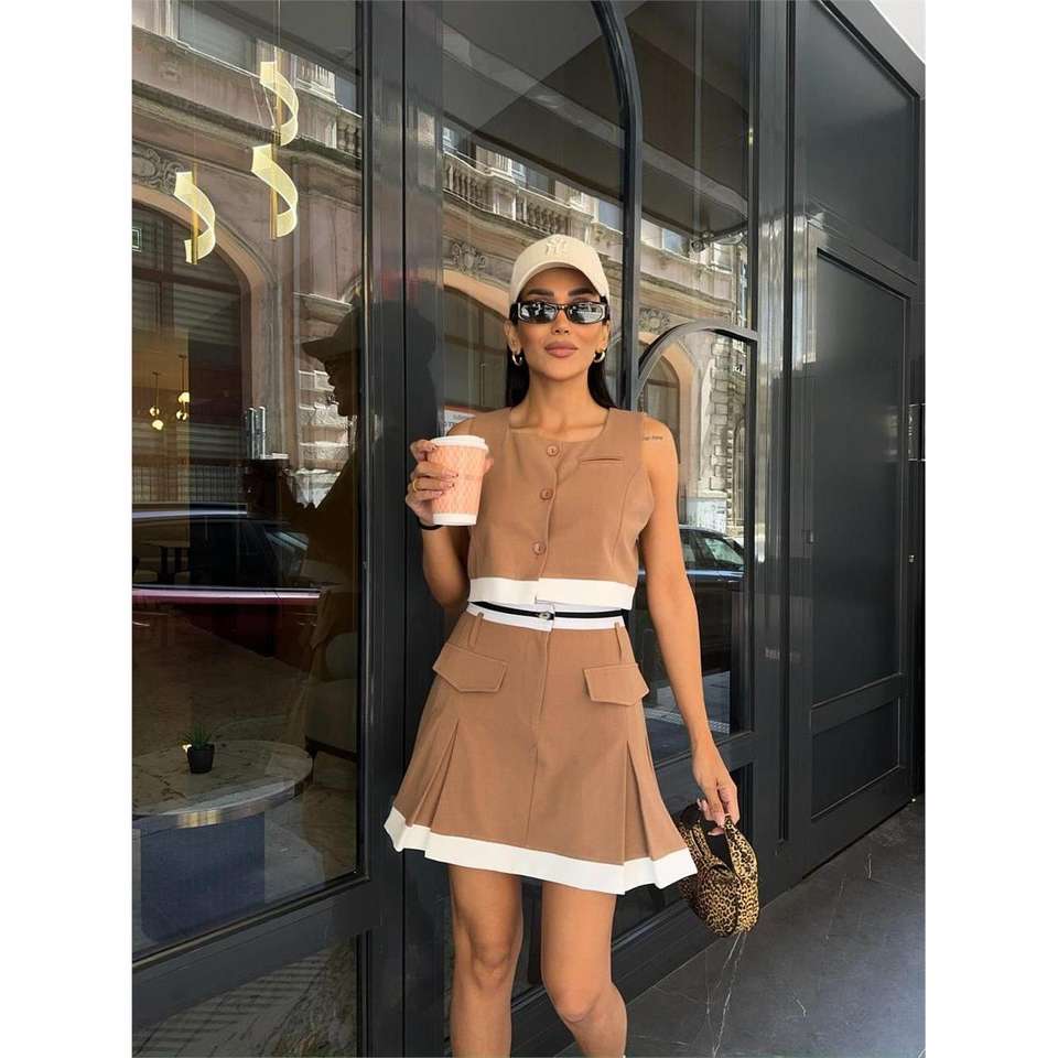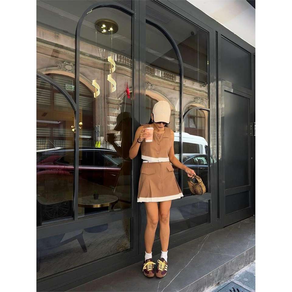 ชุดเสื้อกั๊กสีเบจลายทางและกระโปรงเทนนิส ชุดลำลองสำหรับใส่ทุกวัน เสื้อคลุมคาร์ดิแกนและเสื้อตัวยาวแบบเรียบและลายพิมพ์ ทำจากผ้าวิสโคส
