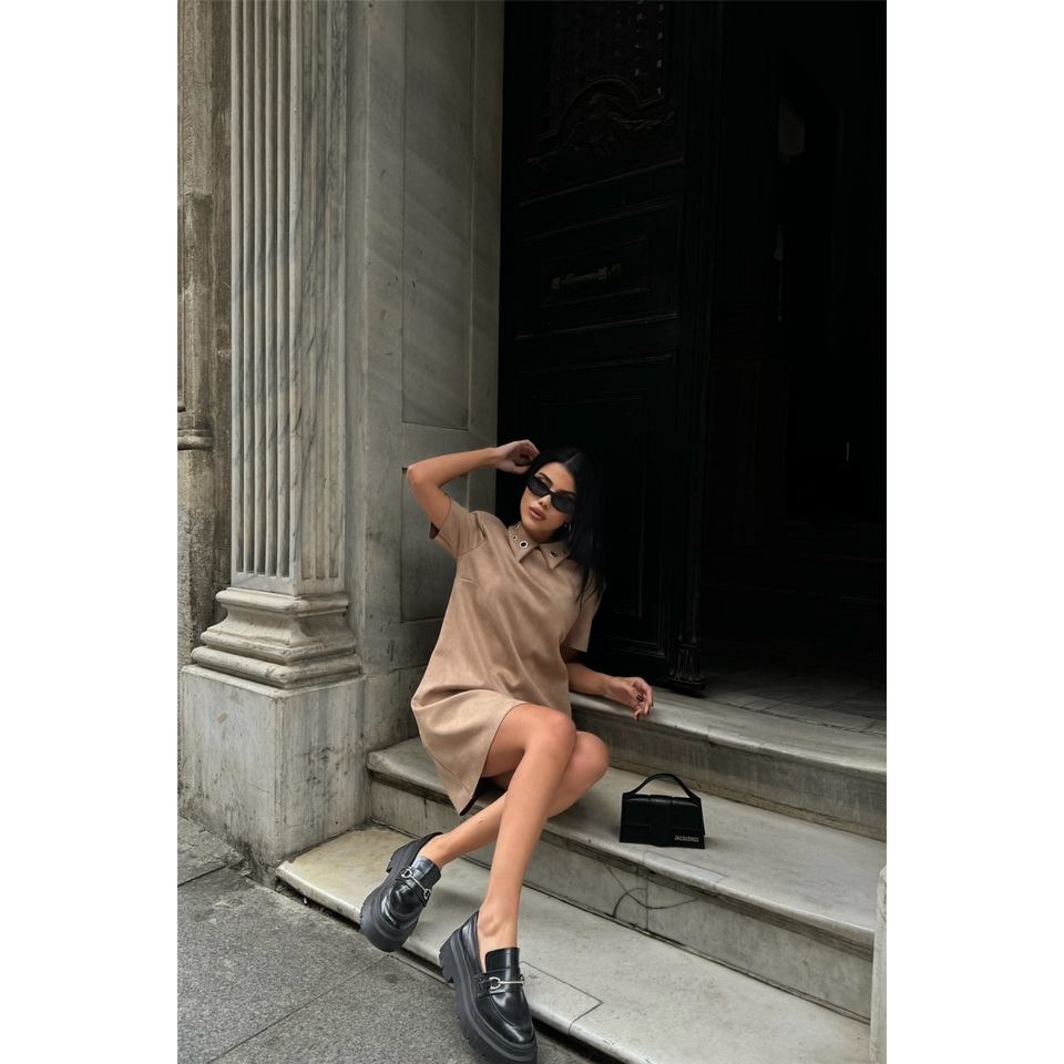 เดรสสั้นผ้าหนังกลับสีเบจ แต่งรูตาไก่ที่คอเสื้อ ลายจุด สไตล์ทางการ รับทำโลโก้ ไซส์ XS ราคาถูก รับผลิตแบบ ODM