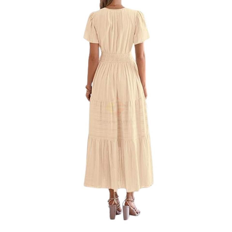 เดรสยาวทรงเอไลน์สีเบจ แขนสั้น เอวสม็อค สไตล์โบฮีเมียน สำหรับฤดูร้อน สีกลางๆ เสื้อผ้าแฟชั่นผู้หญิง ขายส่ง