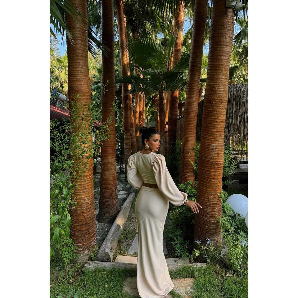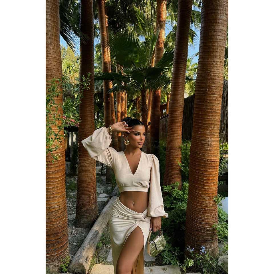 ชุดเซ็ตสองชิ้นสำหรับผู้หญิง สีเบจ ไซส์ XS กระโปรงผ่าข้าง พร้อมเสื้อเข้าชุด สั่งซื้อขั้นต่ำ 2 ชิ้น