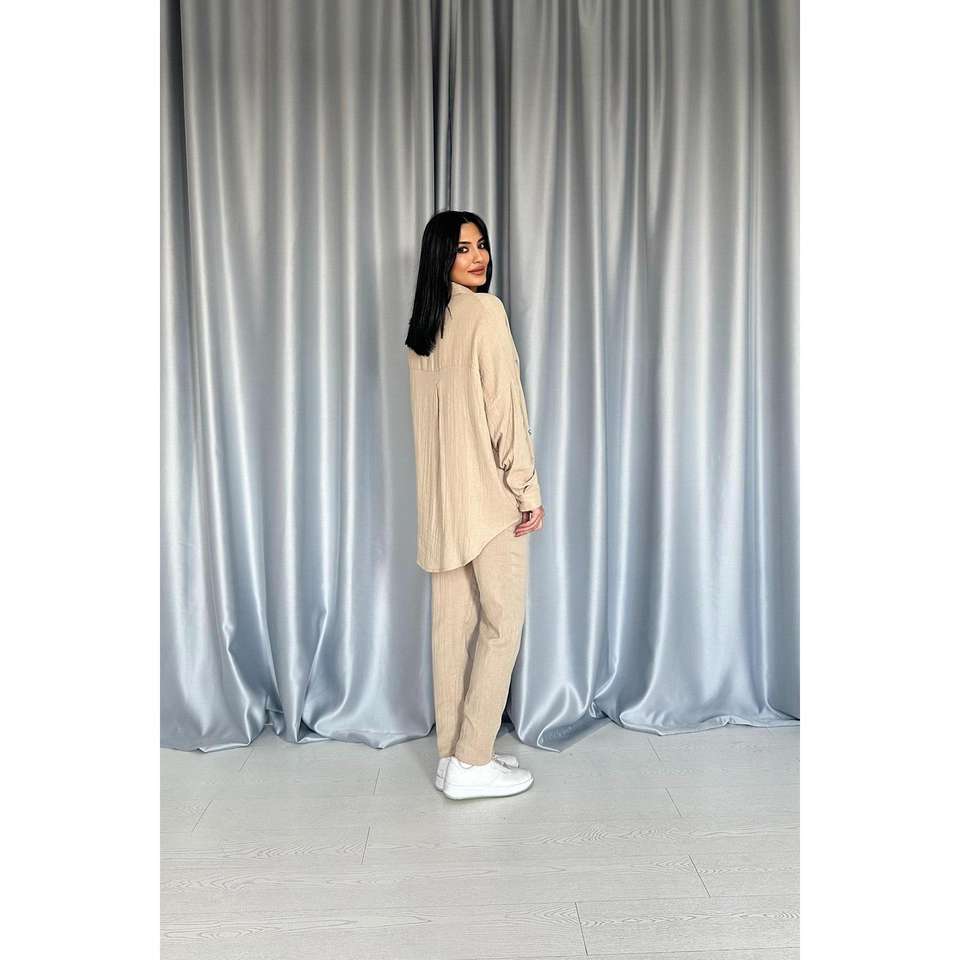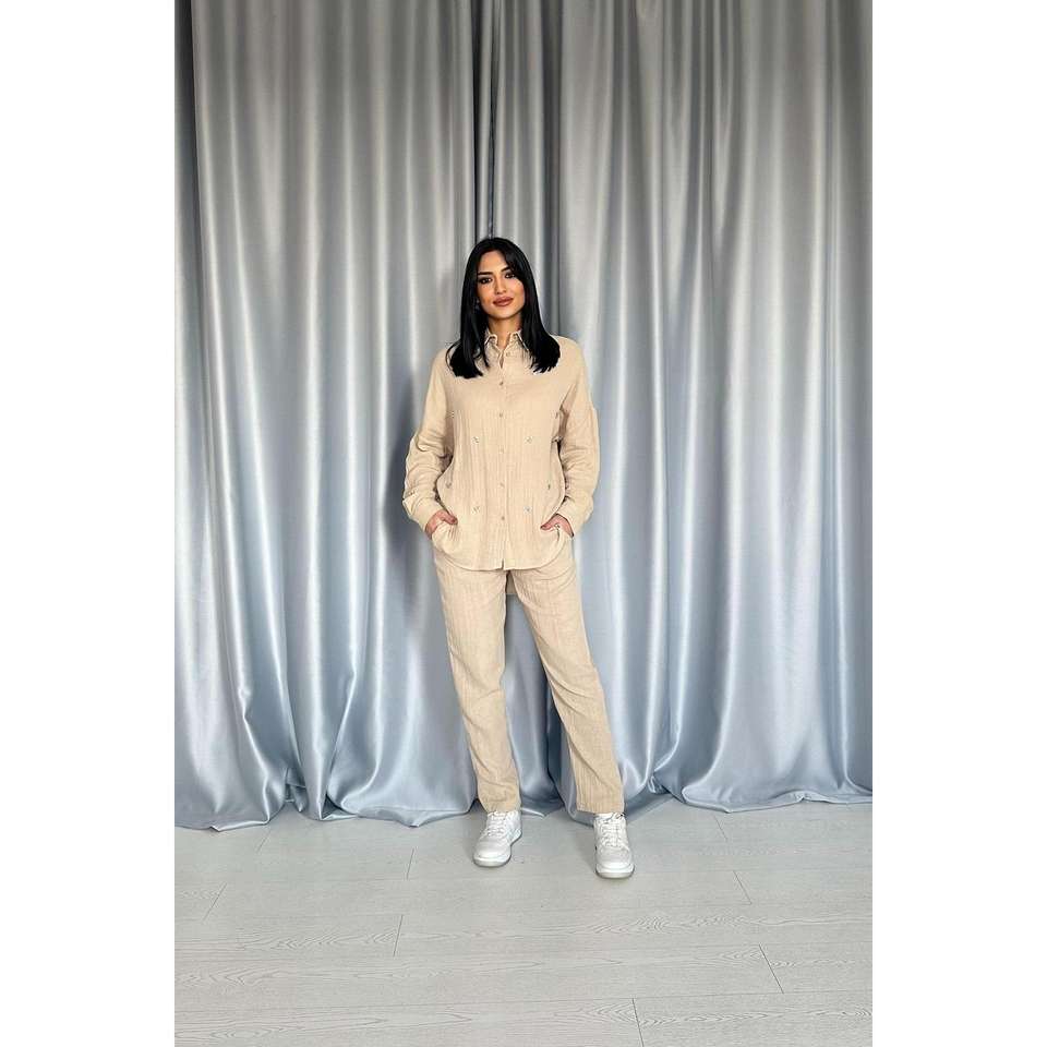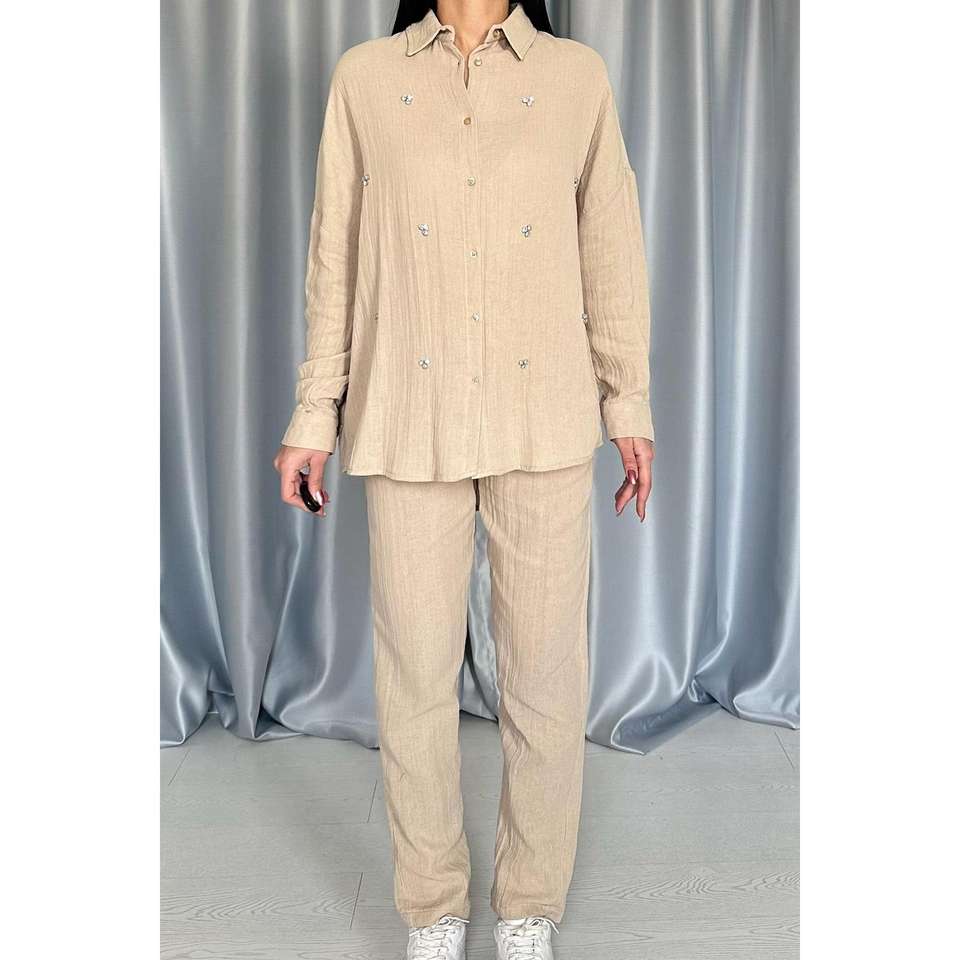 ชุดเสื้อเชิ้ตและกางเกงผ้าฝ้ายสีเบจสำหรับผู้หญิง ระบายอากาศได้ดี เหมาะสำหรับใส่ลำลอง