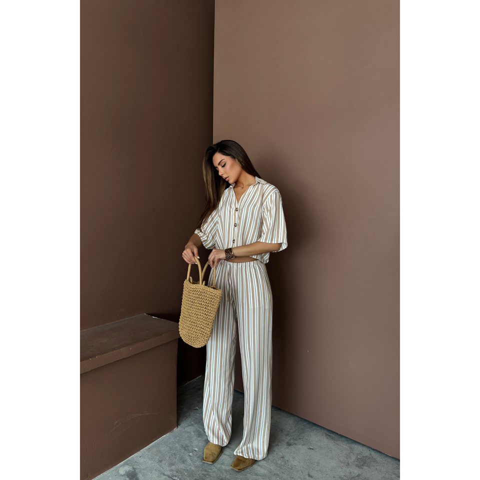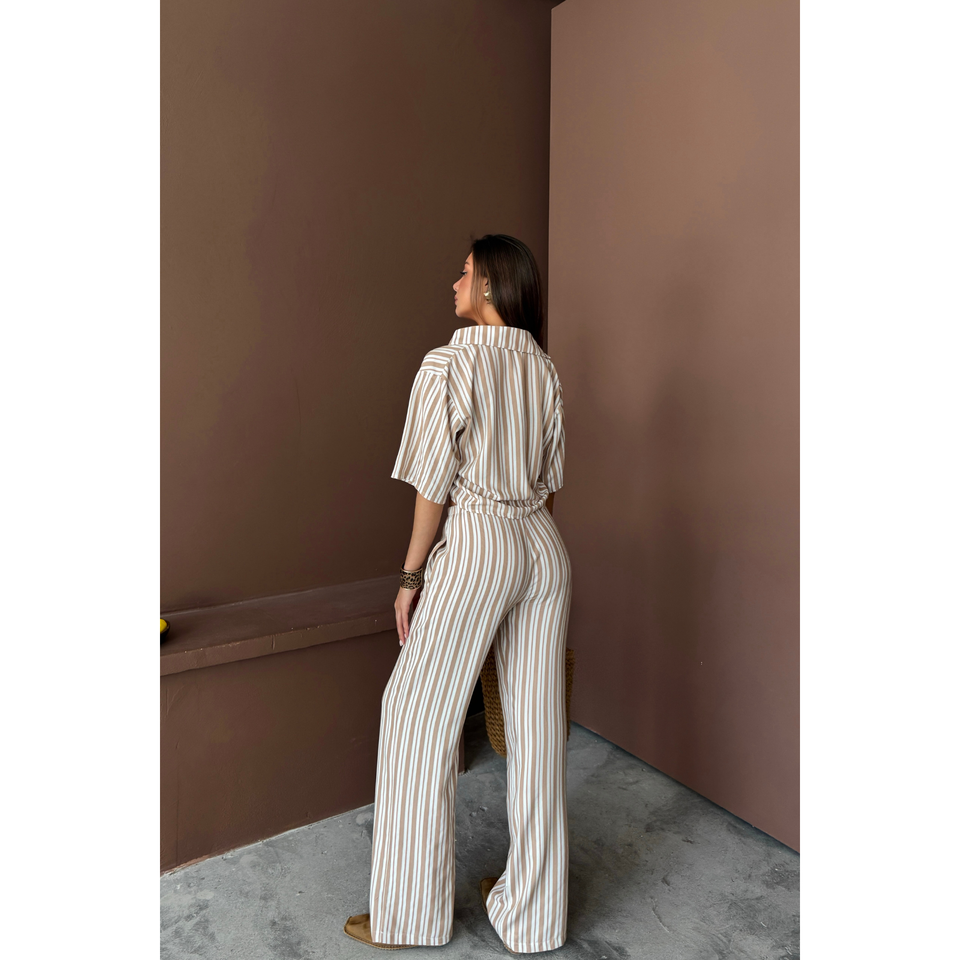 ชุดจั๊มสูทและเพลย์สูทสีเบจสำหรับผู้หญิง เสื้อครอปลายทางและกางเกงขายาวทรงหลวมผ้าโมดอล